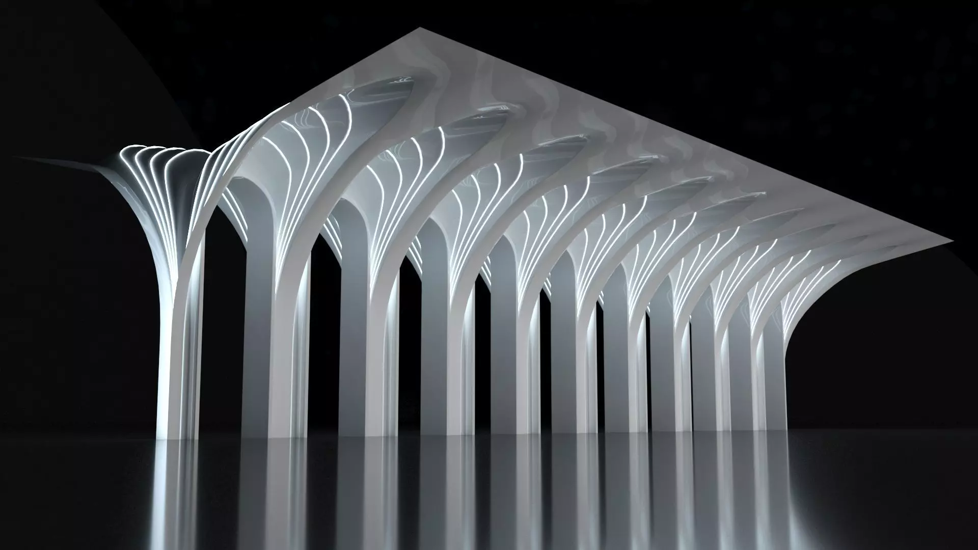 • A high-poly, detailed model of a futuristic, organic arched shade structure, consisting of 11objects named logically with appropriately placed pivots.Modeled in 3ds Max 2021 and rendered with Vray 5.