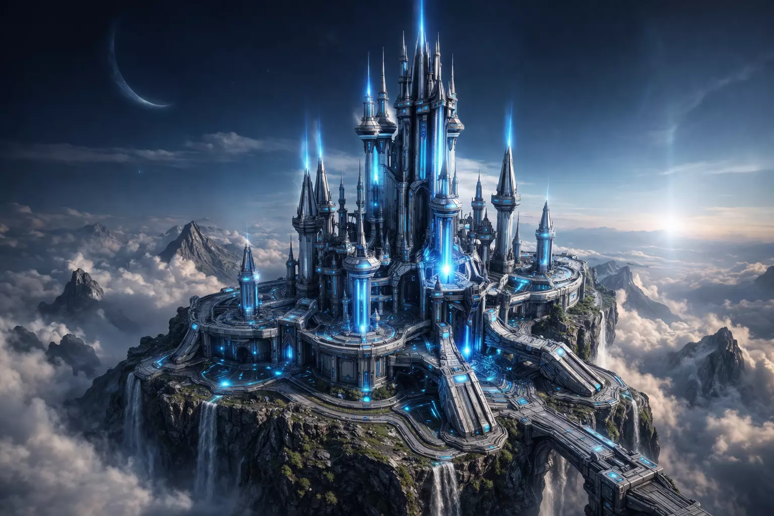High-quality futuristic sci-fi citadel 3D model featuring a highly advanced architectural design with sharp geometric forms, layered structural complexity, and striking emissive energy elements that create a powerful and cinematic visual impact. This futuristic castle combines technological aesthetics with monumental scale, making it an ideal centerpiece for any high-end digital environment.