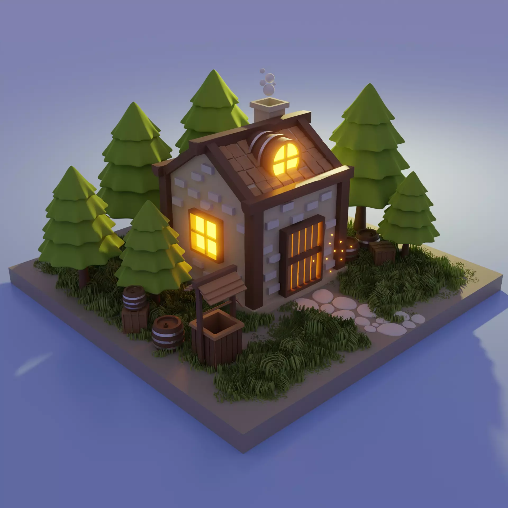 House in the forest lowpoly.Vertices 733206Polygons 7294673d model of a house surrounded by fir trees in the lowpoly style. There are models of barrels, boxes, and a well on the stage. The grass was made using a particle system. The composition is set up: glow and contrast.