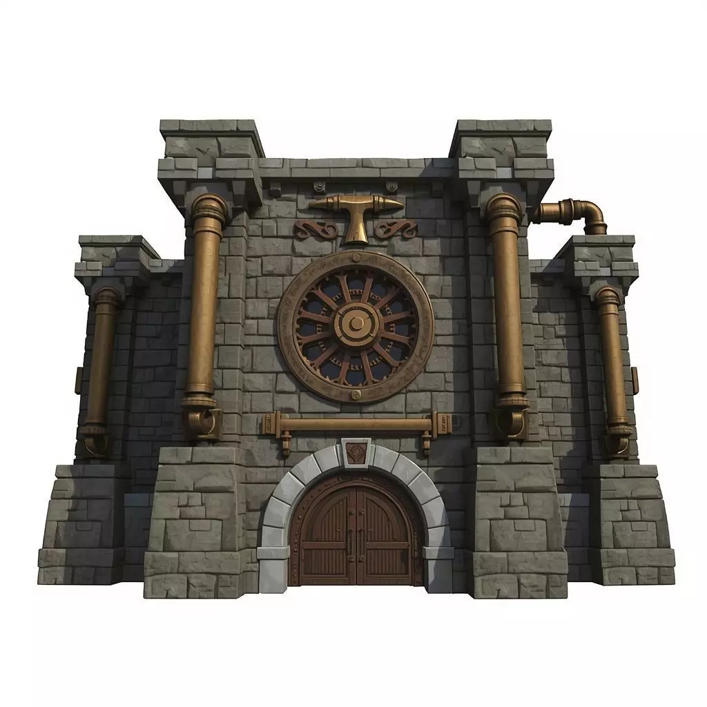 Central Turbine Vent The face of the building is dominated by a massive circular grate or window with a wheel-spoke design. It resembles a giant ventilation fan or a blast furnace intake, reinforcing the magical industrial theme of the asset.