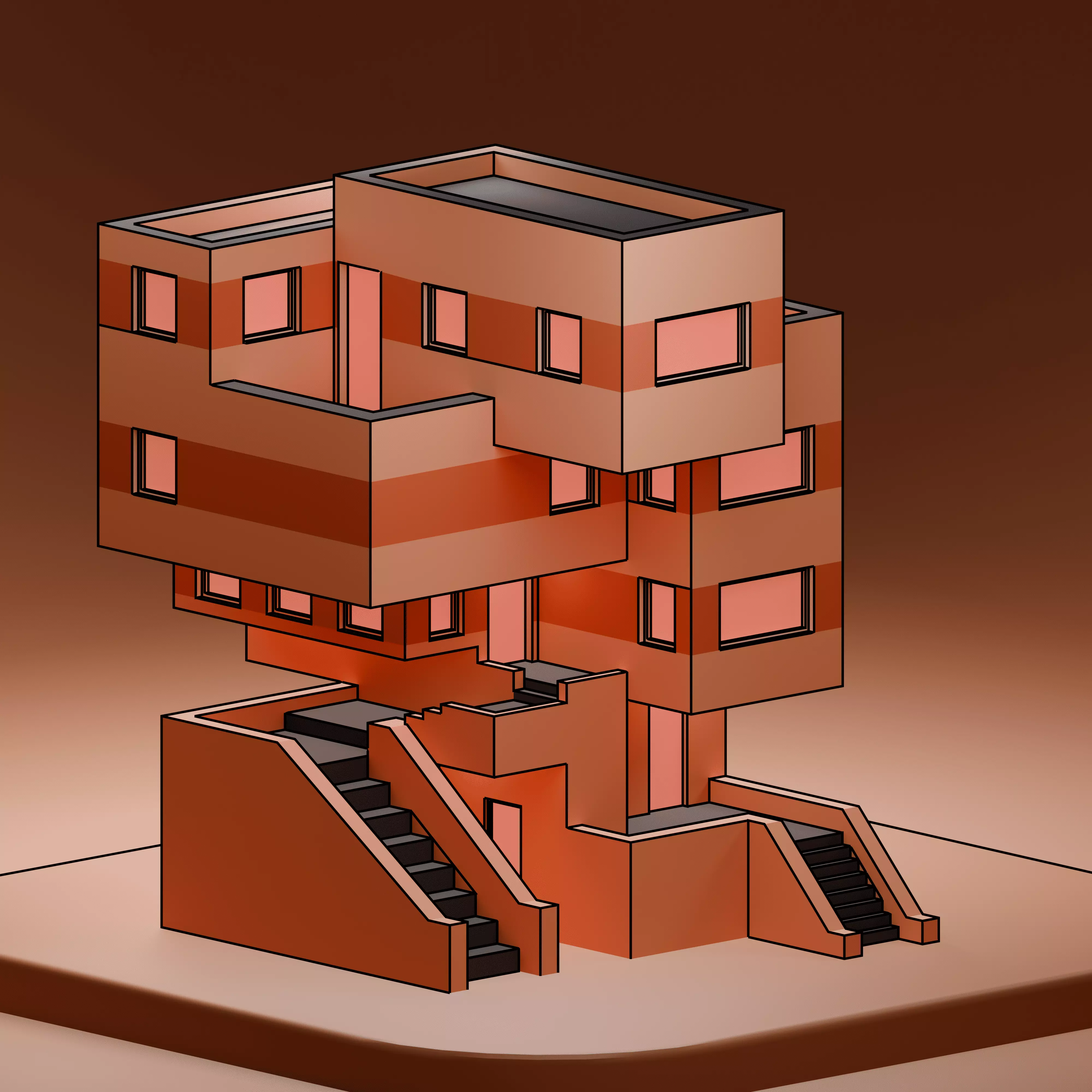 Isometric low poly brutalist house 3D model, optimized for games and real-time applications