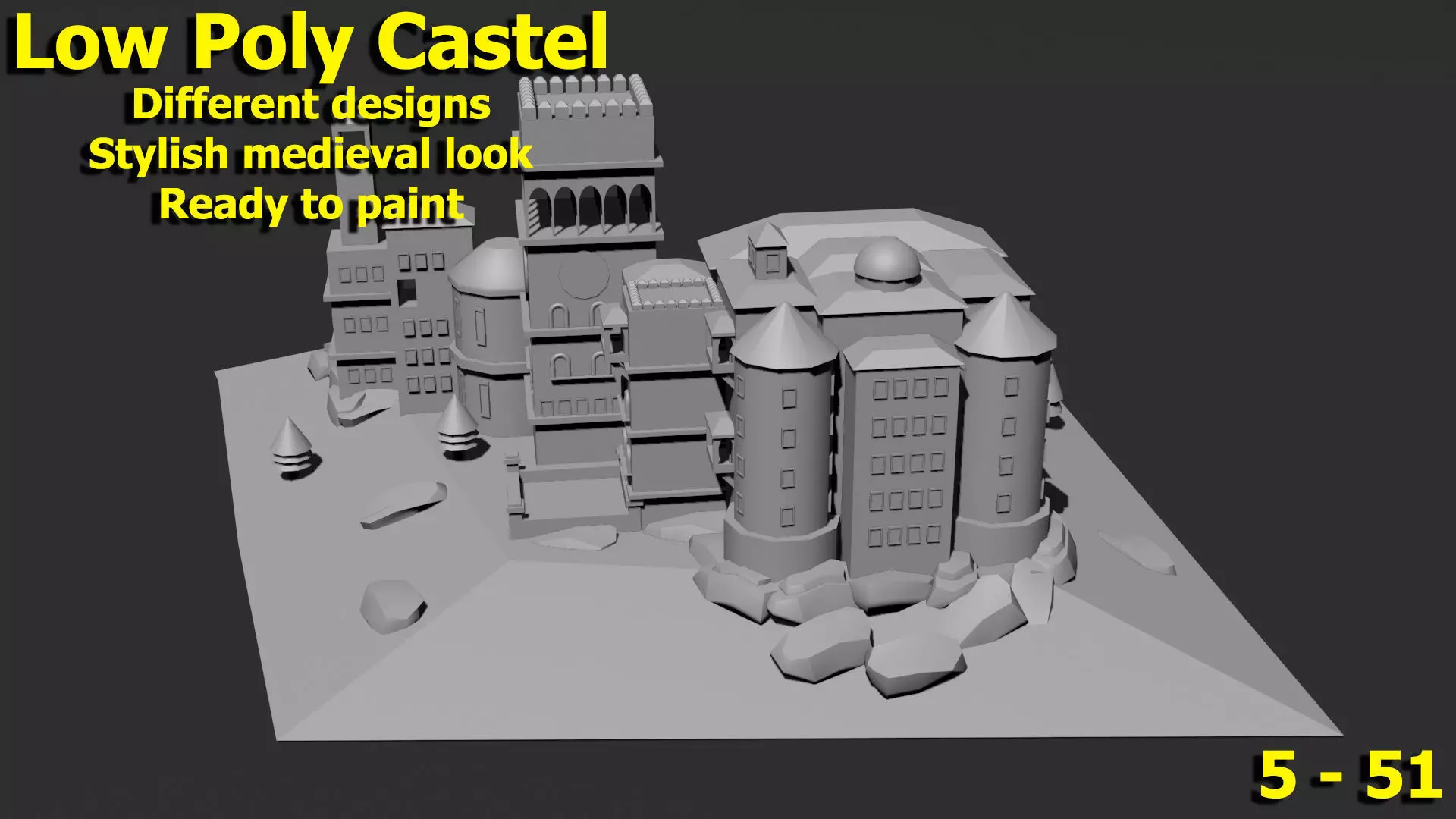 3D Low poly castle designs can be colored as desired and used in many different areas. These castles, which are a mixture of medieval and modern life, blend in the best way with their enriched designs in the areas where they are used. Low poly castle options prevent unnecessary memory usage in games or other projects thanks to the low polygon number. 51 castles, each of which is different from each other, can be used together in a single project if desired and provide a perfect harmony.