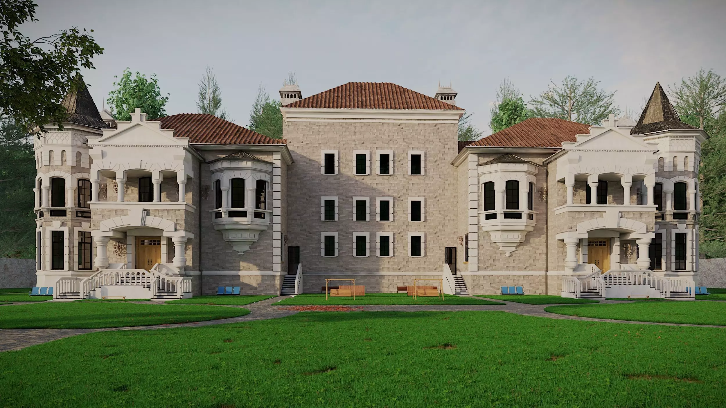 This 3D model represents a luxury classical-style school building designed and modeled in SketchUp, rendered using V-Ray. The structure combines elegant architecture with realistic detailing—perfect for architectural visualization, animation, and rendering projects.