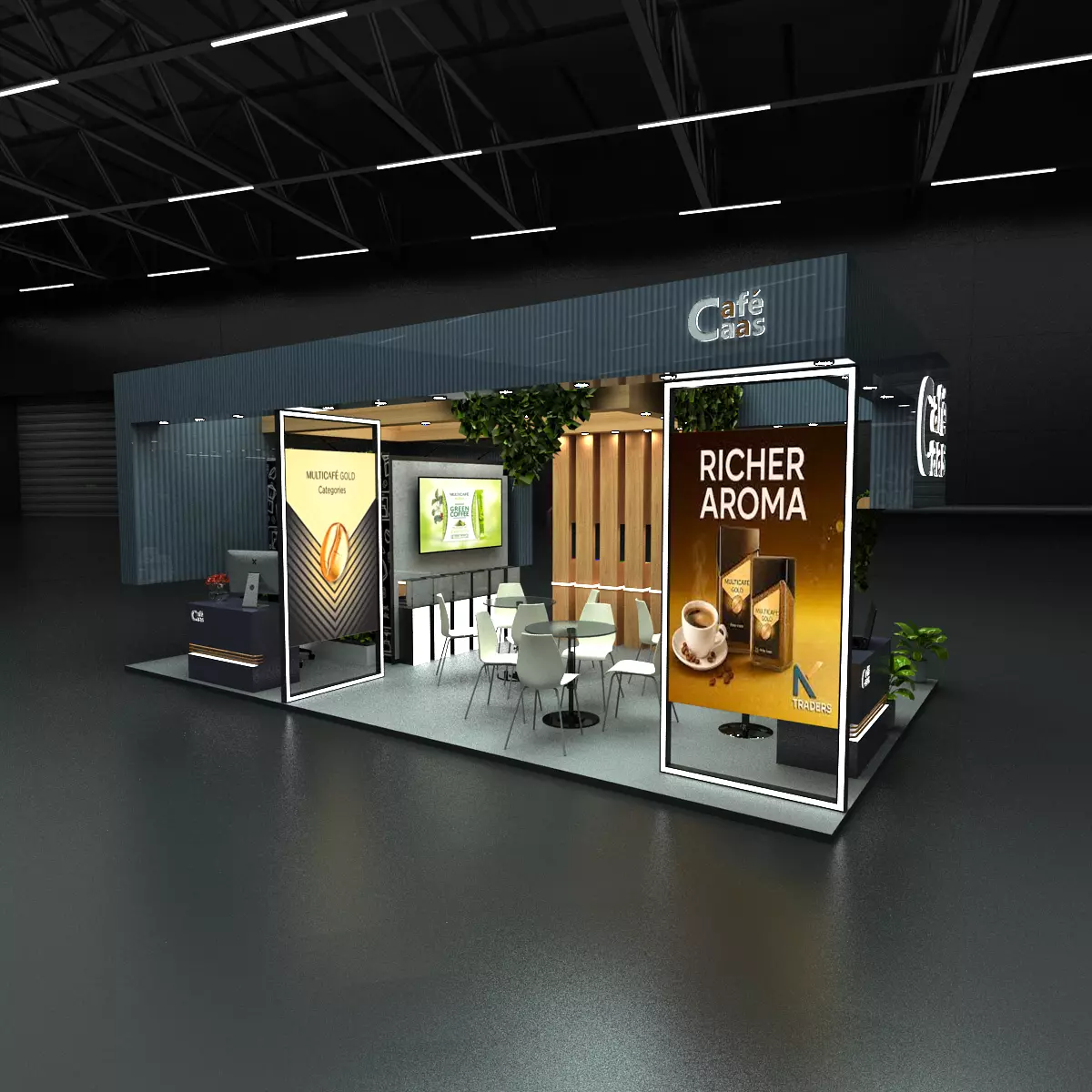 high-fidelity 3D booth model, titled CasaCafe, is professionally optimized for architectural visualization and exhibition design. Developed specifically for coffee industry branding, it balances a modern industrial aesthetic with warm, organic elements.