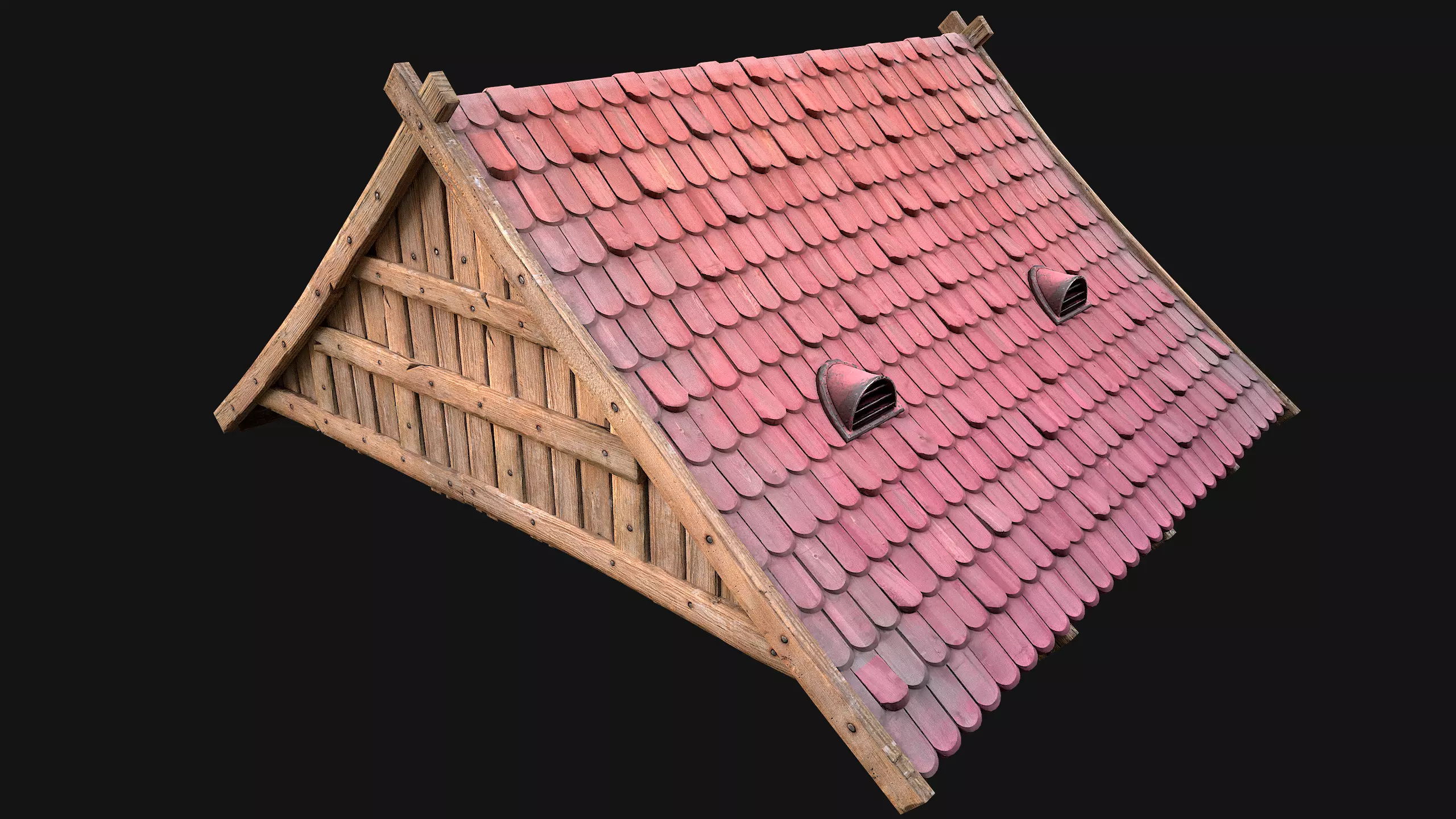 Game ready model Medieval Tile Roof Modular .The model contains lods, detailed information on the images.Stylized and detailed Medieval Tile Roof Modular textured, sculpted and rendered with Physical based rendering (PBR) - Shown images have been rendered in Marmoset Toolbag .The set contains 5 models of roofs with tiles and 3 models of wooden ceilings as well as 1 model of ventilation.