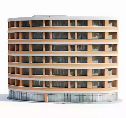 The Overall Concept This asset is a distinctively shaped, multi-story building with a rounded, cylindrical design. It looks like a modern hotel, a high-end apartment complex, or an office tower found in a busy city center.