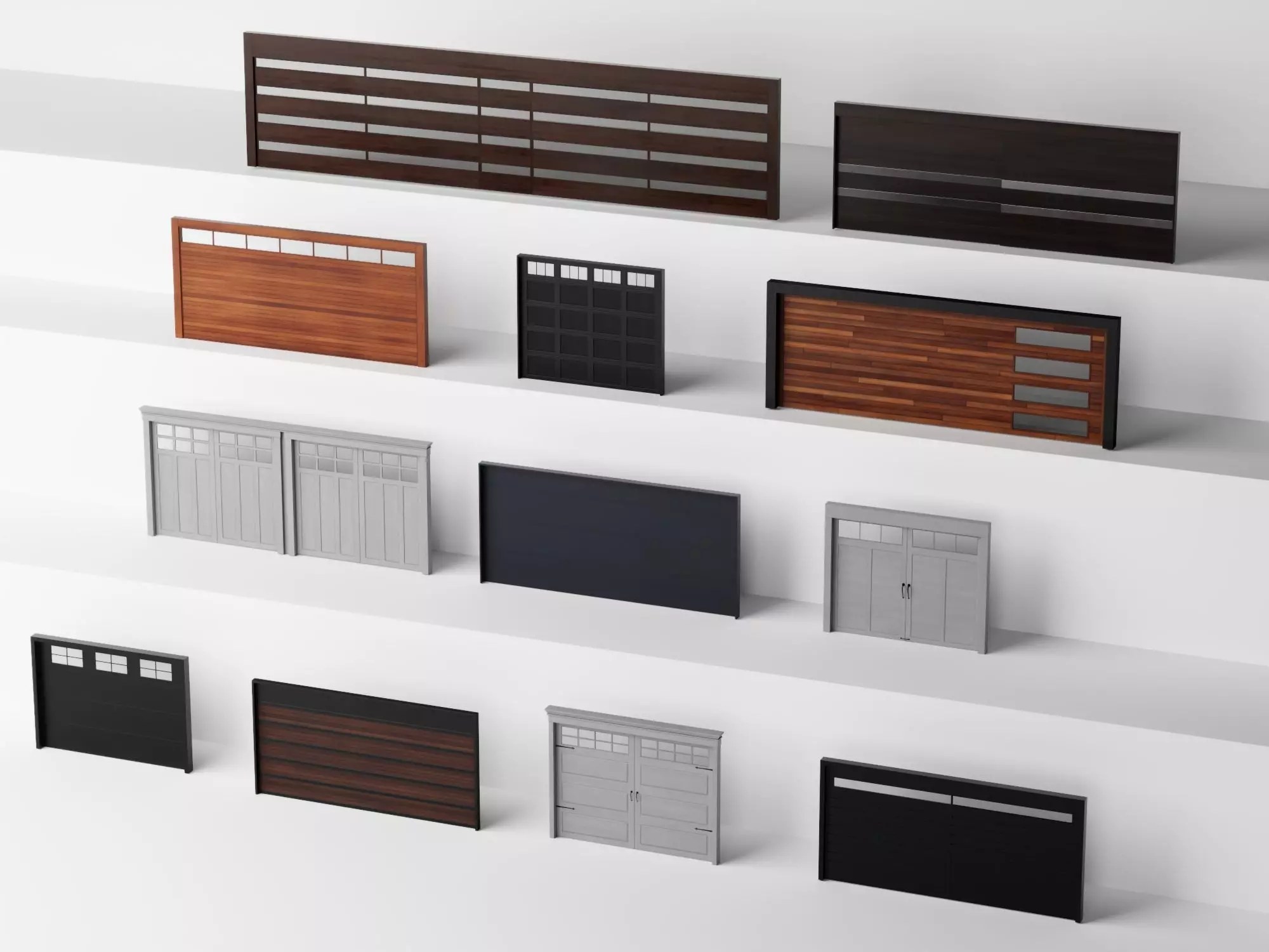 High-quality pack of modern garage doors and sliding gate systems 3D models, featuring: horizontal slat designs with wood-grain and metal accents, double/single panel configurations, privacy louvers, glass window inserts, frame supports, integrated handles/locks, and detailed residential driveway/garage entrance props.Models built to real-world scale with high detail — realistic wood texture grain, powder-coated metal reflections, concrete/brick pillar compatibility, subtle weathering/aging, secure joint mechanisms, and authentic contemporary exterior gate realism.Full PBR workflow with high-res textures (2K-4K): Albedo, Roughness, Metallic, Normal, AO maps for realistic material contrast, wood roughness, metal shine, and depth in any lighting.Ideal for:• Architectural visualization and exterior renders• Garage door, driveway gate, villa entrance, and courtyard builds• Residential exterior and property boundary scenes• Game assets (Unity/Unreal ready)• VR/AR home exterior and security simulations• VFX, promotional videos, landscape designOptimized polycount for real-time — drag and drop to enhance scenes instantly.Compatible formats:MAX (with materials), OBJ, FBXCompatible with 3ds Max, Maya, Blender, Cinema 4D, Unity, Unreal Engine, and more.