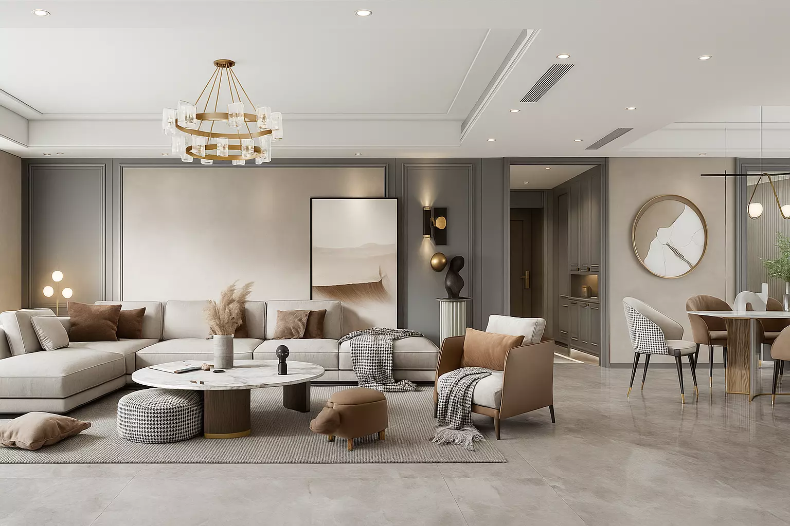 This open-plan layout features a spacious living area with a premium sectional sofa, designer armchairs, and a marble-top coffee table that sits on a soft area rug. The adjacent dining space showcases a refined dining table surrounded by velvet upholstered chairs, illuminated by an elegant geometric chandelier. The room’s aesthetic is completed with large panoramic windows, neutral color tones, and soft natural lighting, creating a bright and harmonious atmosphere.