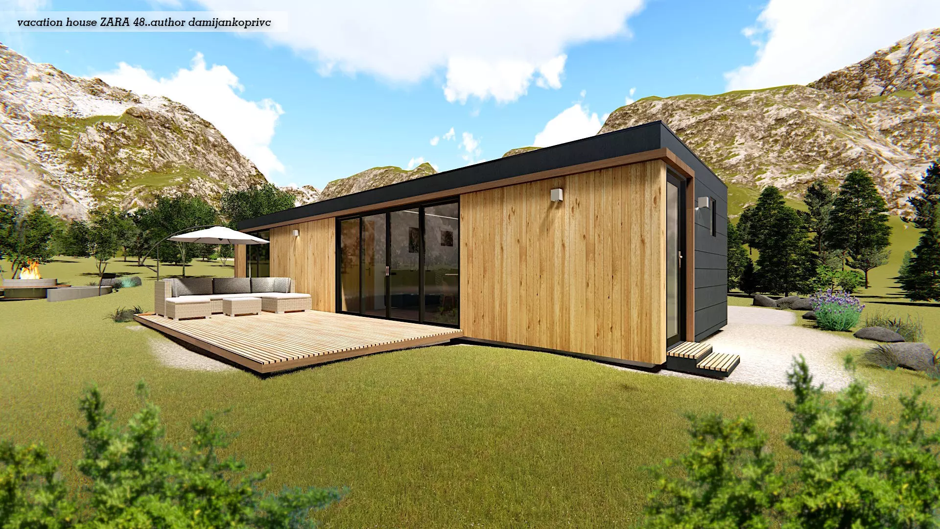 odern designed mobile home,tiny house, vacation house on 48 m2 with terrace and fully furnished interior. Model is produced in Slovenija by my company.Camping site combination included. Unique designed,modern,highly detailed model with lot of useful 3D models and furniture in it.Model contains house with all the furniture in ,living room,kitchen ,kids room,bedroom,bathroom and terrace.(shower,sink,faucet,toilet,bath,sofa,bed TV,outdoor lounge,dinning table,rugs,bunk bed..) And also lot of decoration. On the front side of the house ,there is big and nice terrace .This model have big glass sliding doors.Kitchen is actually designed for a known customer and contains Owen,induction plate ,hood,sink... Suitable for sea site area as for the mountain areas and all kind of camping resorts. Model is done with sketch up and rendered with v-ray. All textures appliances and furniture equipment is in high resolution,have been checked and are included in scene.Textures are compresed in skp file.Model is easy to manipulate and ready to render with v-ray.DWG plans included...