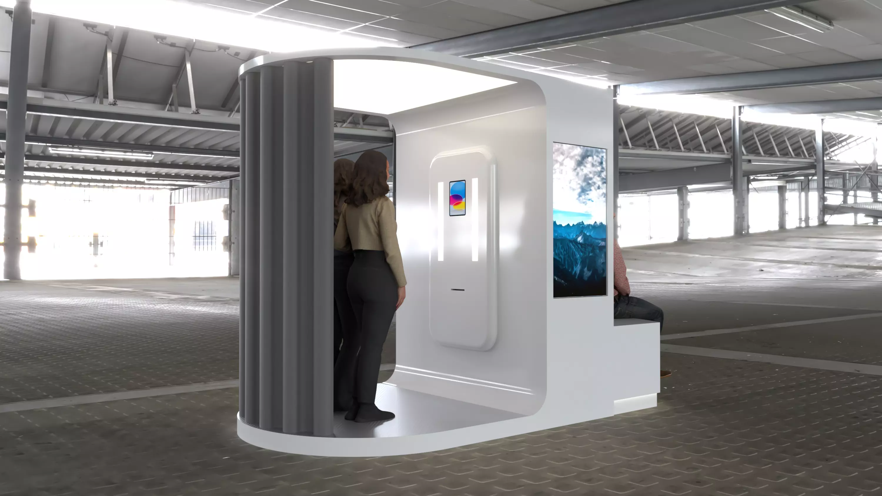 This modern photobooth kiosk features a clean, futuristic, and minimalist design, making it ideal for events, exhibitions, malls, airports, and other public spaces. The enclosed structure provides a comfortable and semi-private experience for users, while the open side keeps the design inviting and accessible.