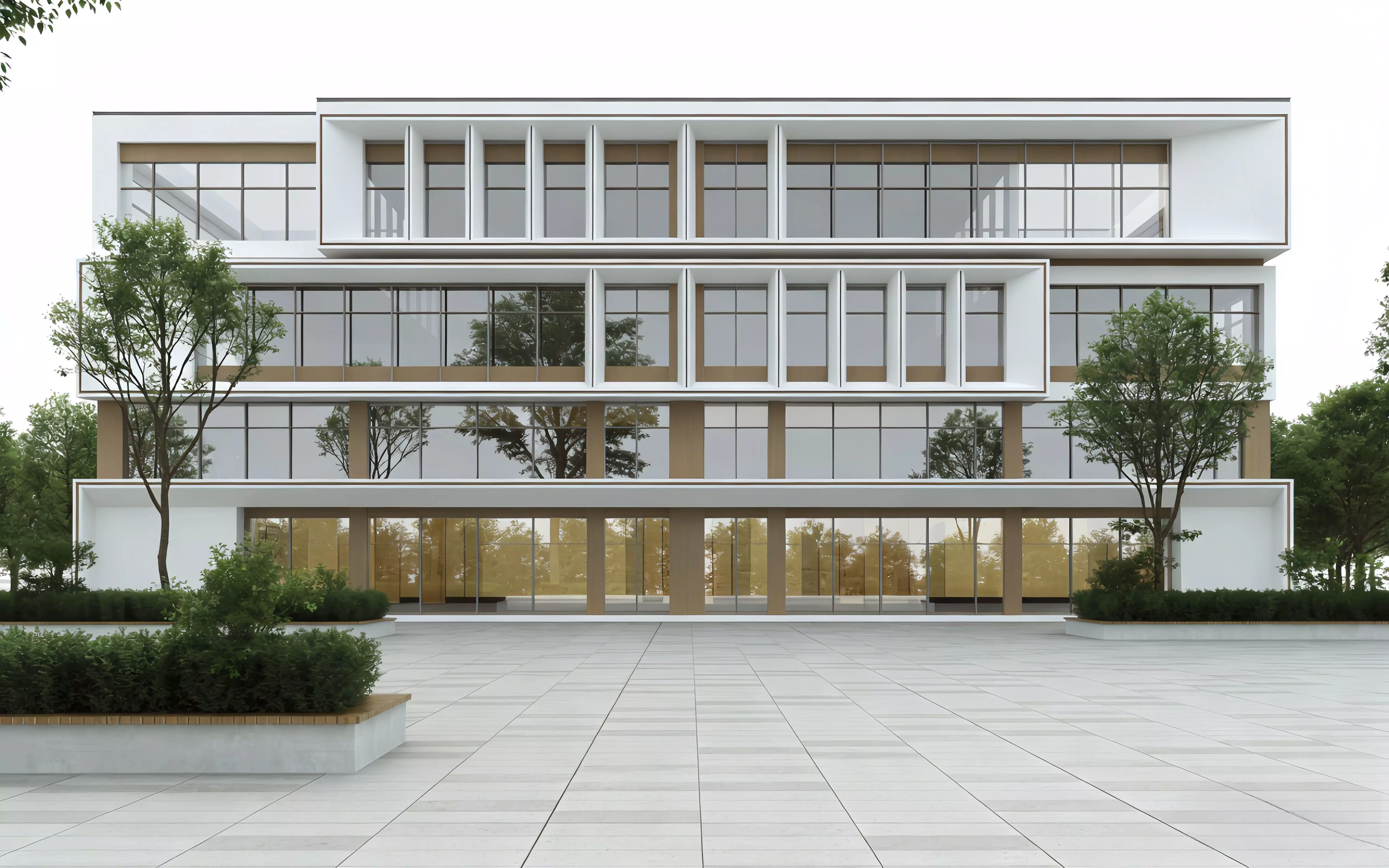 This is a four - story office building with a modern minimalist style. The overall base is white, matched with large - area glass curtain walls and light wood decorative lines, presenting a clean, transparent, simple and elegant visual effect. The building facade adopts regular geometric division, forming a sense of order through vertical window frames and horizontal lines. The large - area glass windows ensure good natural lighting and transparency.In front of the building is an open light gray paved square, with trees and low shrubs arranged on both sides, creating a comfortable public landscape atmosphere. The overall design emphasizes simplicity, lightness and functionality, meeting the aesthetic and usage needs of modern office buildings. It is suitable as an enterprise office building, public service building or creative park building.
