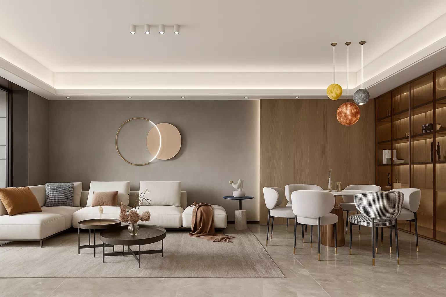 The living area includes a plush L-shaped sofa, minimalist coffee tables, and artistic wall decor with integrated LED lighting. The dining area flows naturally within the space, featuring upholstered designer chairs, a sleek round dining table, and statement pendant lights that bring visual harmony to the entire interior. Every detail—from the floor reflections to the subtle lighting—has been carefully optimized to deliver photorealistic results.