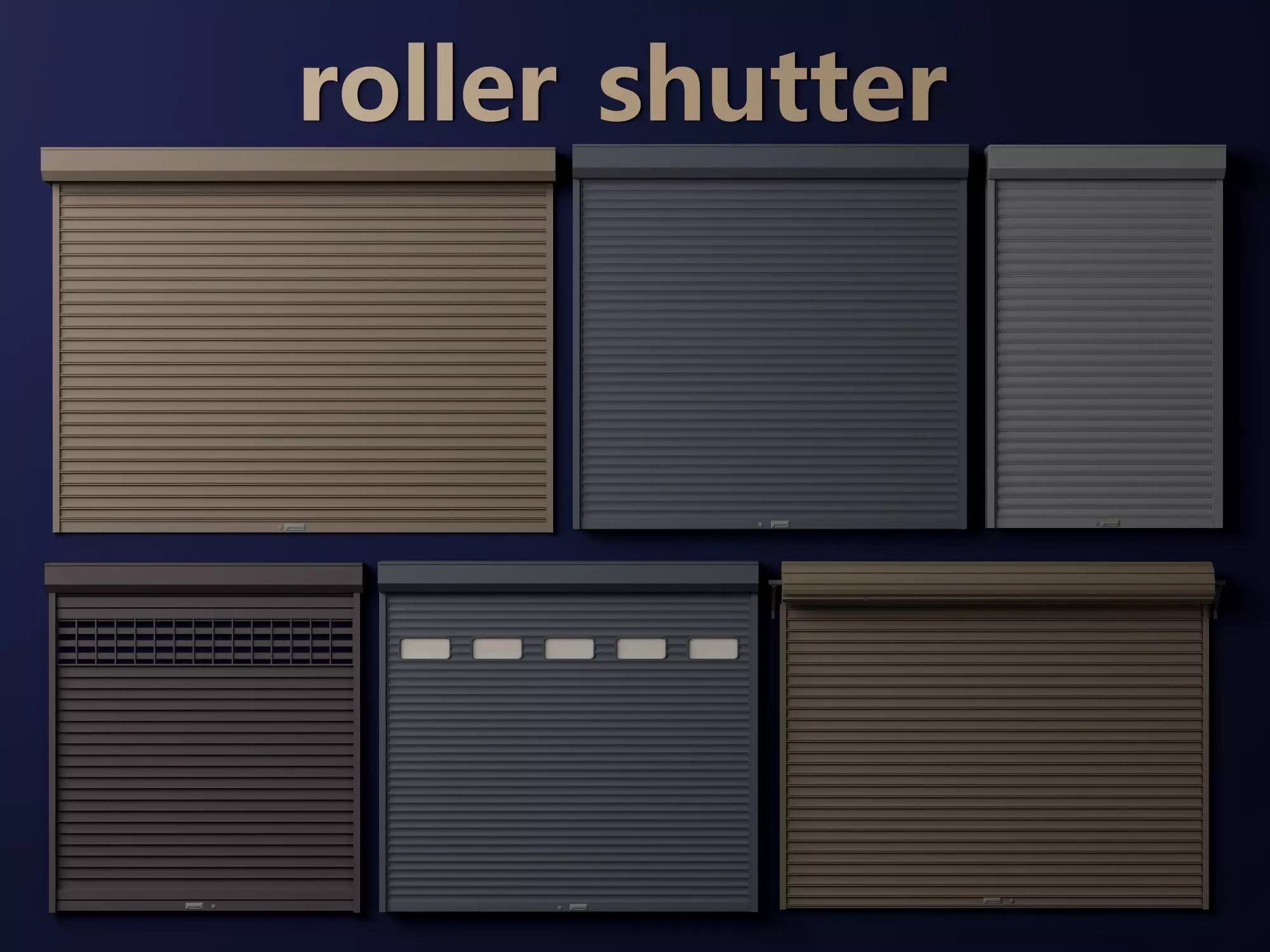 High-quality pack of modern roller shutters and security doors 3D models, featuring: horizontal slat roller shutters in neutral tones (gray, brown, black), fully enclosed/privacy designs, manual/electric operation styles, frame guides, bottom bar reinforcements, and detailed exterior window/garage security props.Models built to real-world scale with high detail — realistic metal slat profiles, powder-coated finishes, subtle texture variations, mechanical joints, weathering/aging effects, and authentic contemporary security shutter realism.Full PBR workflow with high-res textures (2K-4K): Albedo, Roughness, Metallic, Normal, AO maps for realistic metal reflections, surface roughness, and depth in any lighting.Ideal for:• Architectural visualization and exterior renders• Residential/commercial security shutter, window/garage door builds• Facade protection and building envelope scenes• Game assets (Unity/Unreal ready)• VR/AR home exterior and security simulations• VFX, promotional videos, architectural designOptimized polycount for real-time — drag and drop to enhance scenes instantly.Compatible formats:MAX (with materials), OBJ, FBXCompatible with 3ds Max, Maya, Blender, Cinema 4D, Unity, Unreal Engine, and more.