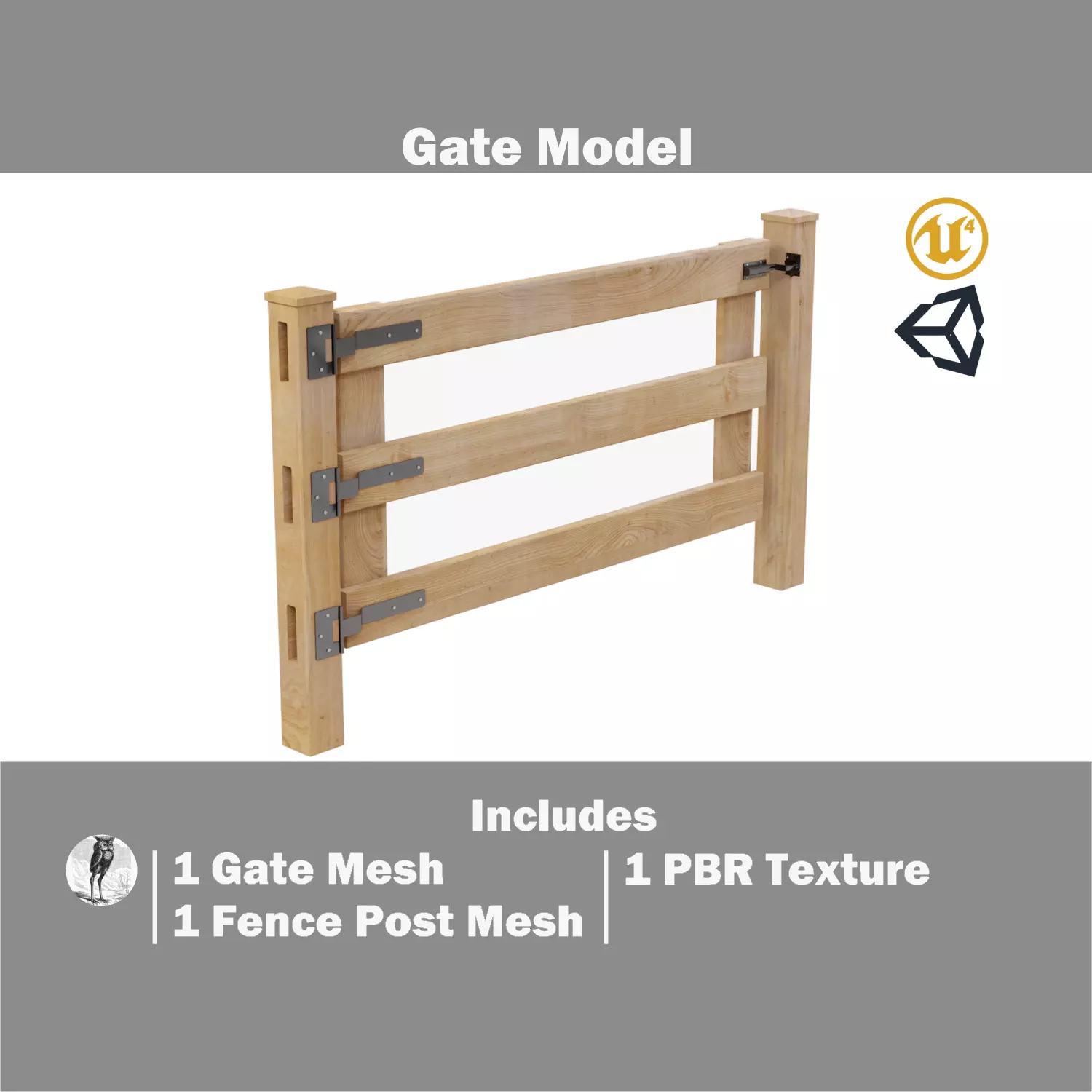 Modular Fence Gate - 3-Rail Estate Fence Gate contains 2 meshes total and 1 PBR texture. Model is packaged as 2 separate meshes, the posts + hinges together and the fence and locking piece together. Both files are named accordingly.