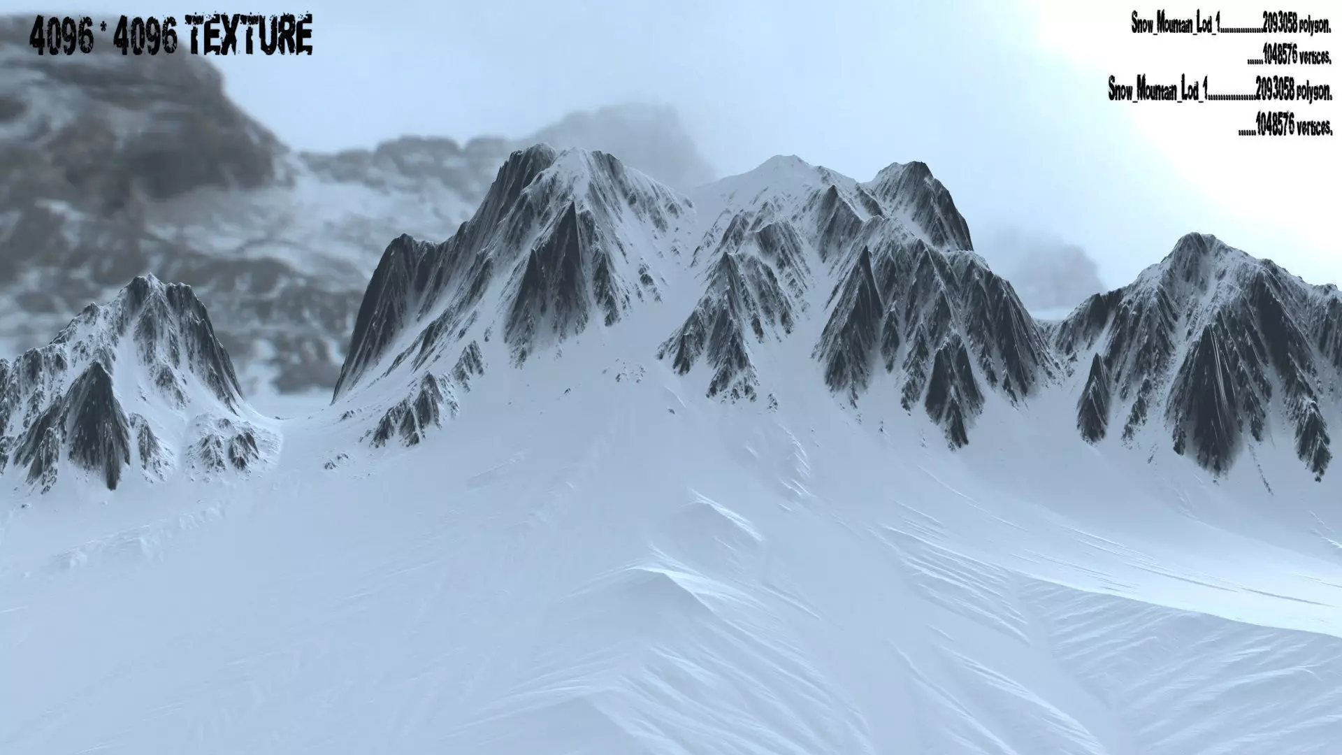 Snow_Mountain........................7938 polygon. ......4096 vertices.Snow_Mountain_Lod_1.................2093058 polygon. .....1048576 vertices.