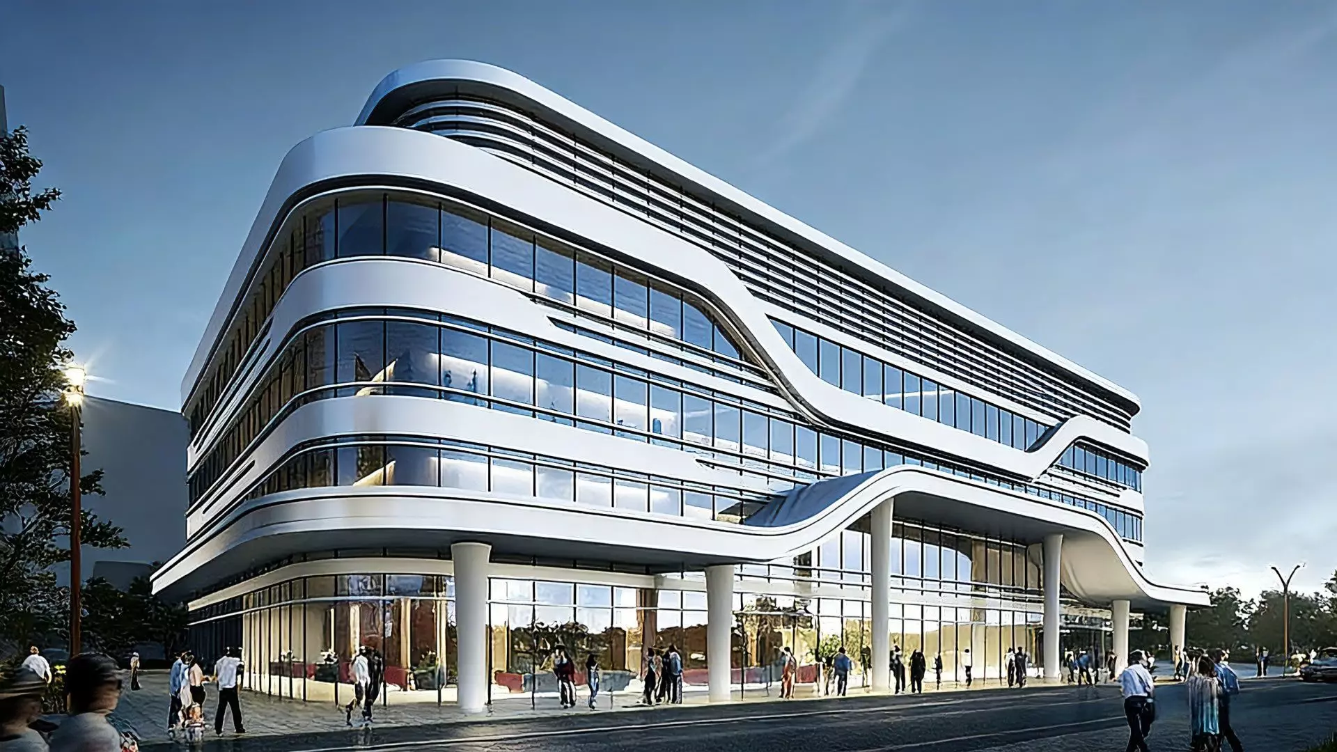 This is a rendering of a modern commercial office building. The building takes fluid, curvilinear forms as its core design language, presenting a strong sense of futurism and dynamic beauty. The facade extensively uses transparent glass curtain walls, paired with white streamlined structural lines, which not only ensure ample natural light for the interior spaces but also give the building a visually light and agile appearance.The ground floor of the building features a large-span colonnade design, creating an open public space that seamlessly connects with the urban streetscape, making it suitable for pedestrian gatherings and public activities. The multi-story structure incorporates setbacks and interwoven lines, which enrich the facade's layering and enhance the building's sculptural quality. The overall design integrates modern aesthetics with practical functionality, making it suitable for high-end office use as well as a mixed-use urban complex combining commercial and leisure functions. It is a landmark building in the city that offers both visual impact and human-centric design.