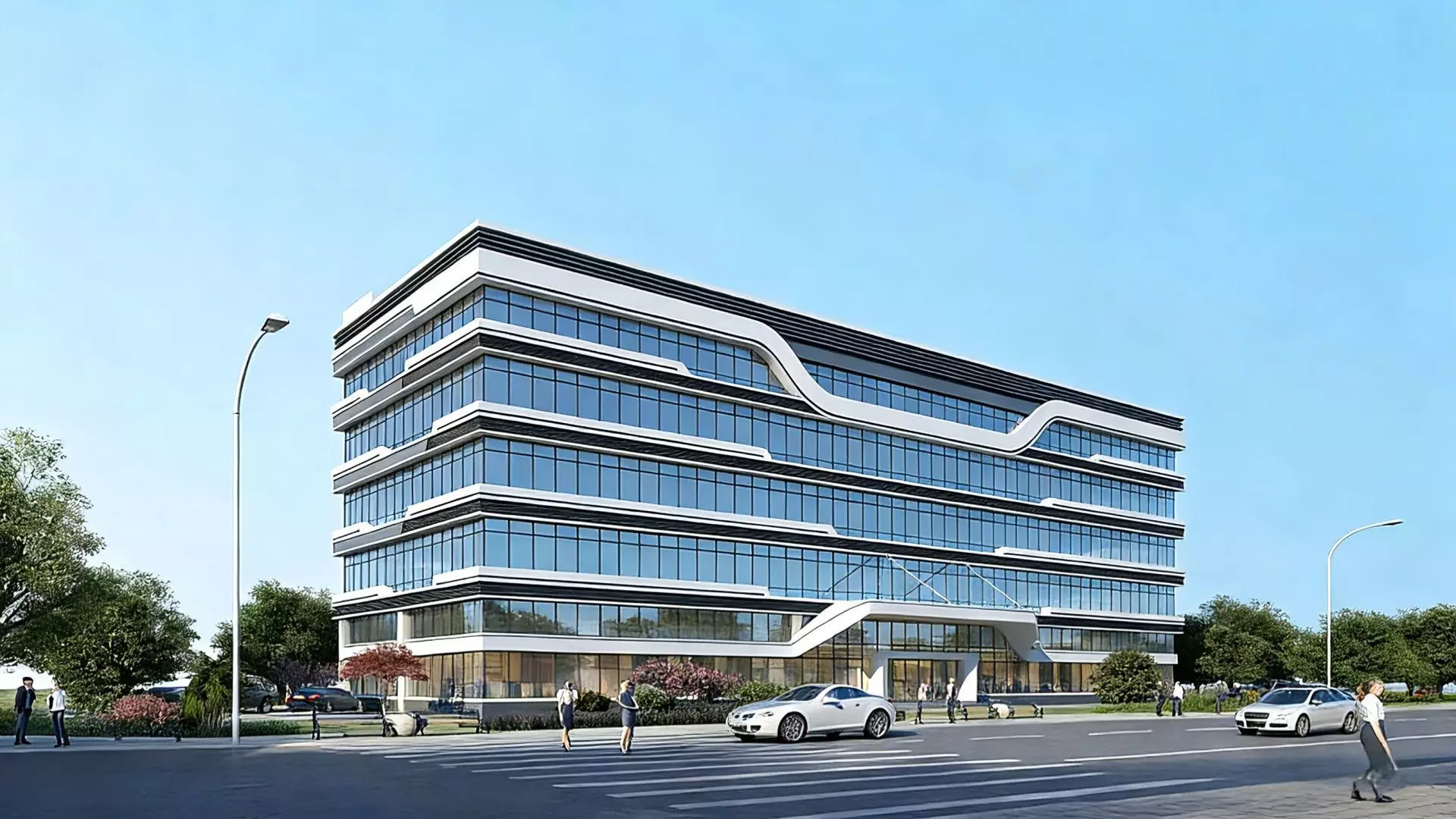 The image presents a modern multi-storey office building with an overall minimalist, grand and high-tech style. The building’s facade features an extensive use of transparent glass curtain walls integrated with white lines, complemented by sleek curved shapes. This design not only enhances the spatial transparency and natural lighting but also endows the building with a strong sense of modern dynamism and layering.The building has a neat structural layout, and its multi-storey configuration exudes stability and grandeur. The open and transparent design of the ground-floor entrance improves the spatial accessibility and creates a sense of ceremony.Surrounded by well-equipped road facilities, green landscapes, as well as pedestrians and vehicles coming and going, the building fosters a prosperous and vibrant business office atmosphere. Overall, it fully demonstrates the professionalism, efficiency and modern vibe of a high-end commercial office space.