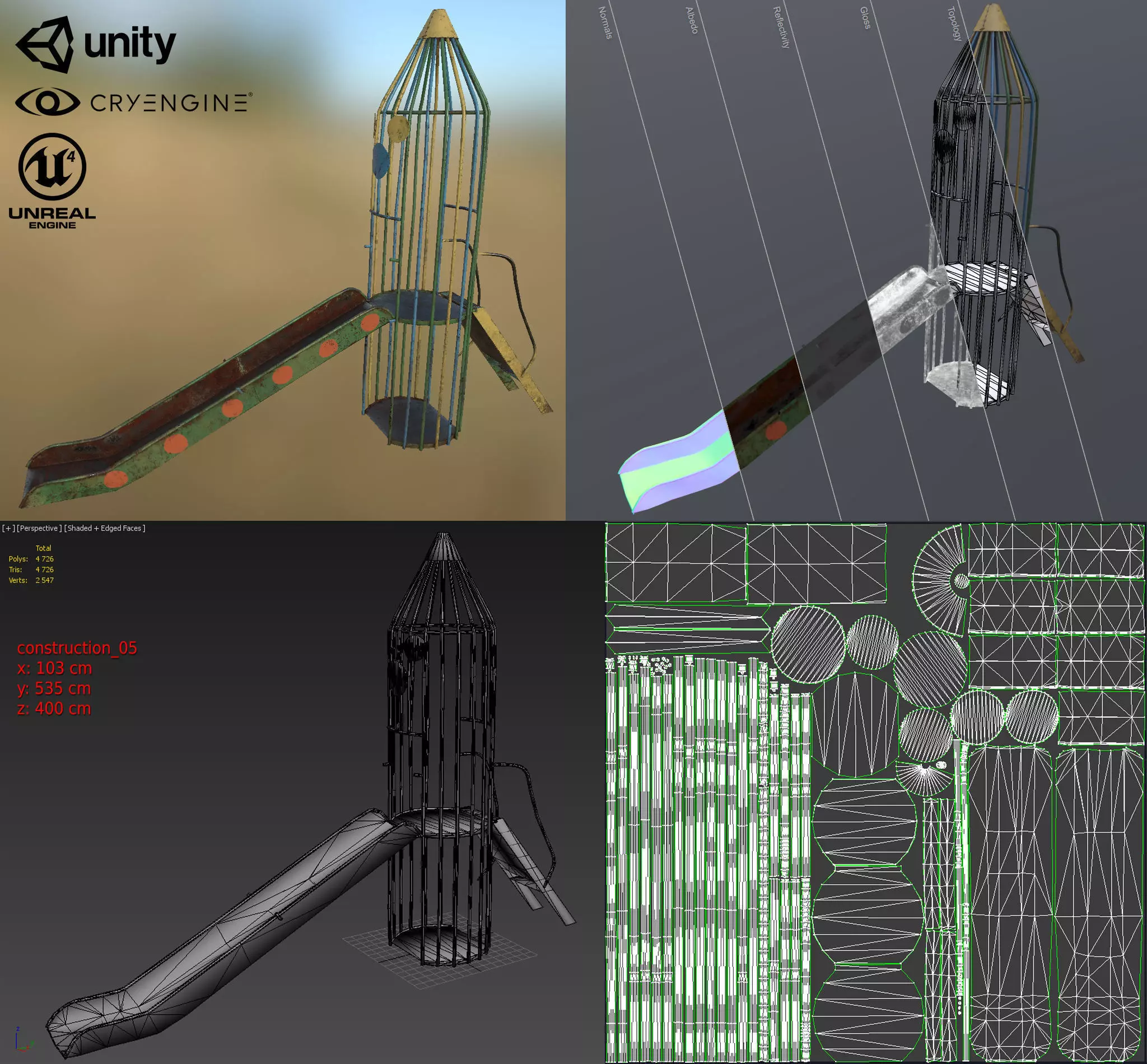Ready for use in game engines such as Unity3d, Unreal Engine 4, CryEngine 5. Normal map was baked from a high poly model. The textures of the model are applied with UV Unwrap. Including OBJ, FBX formats and textures (4096x4096) TGA, TIF Units used: cm, model is x: 103, y: 535, z: 400cm Polygons: 4726 Triangles: 4726 Vertices: 2547