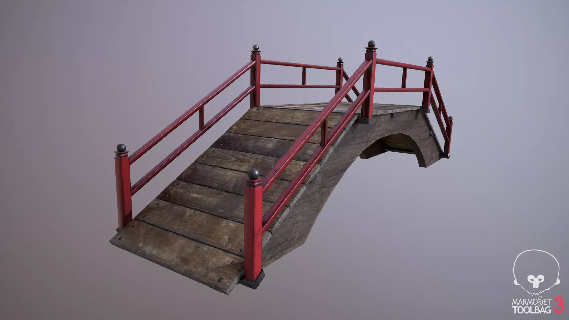 An oriental style bridge, with wooden planks and metal red rails. Planks and metal parts are dirty and aged.Available in different formats. Low poly, gameready.