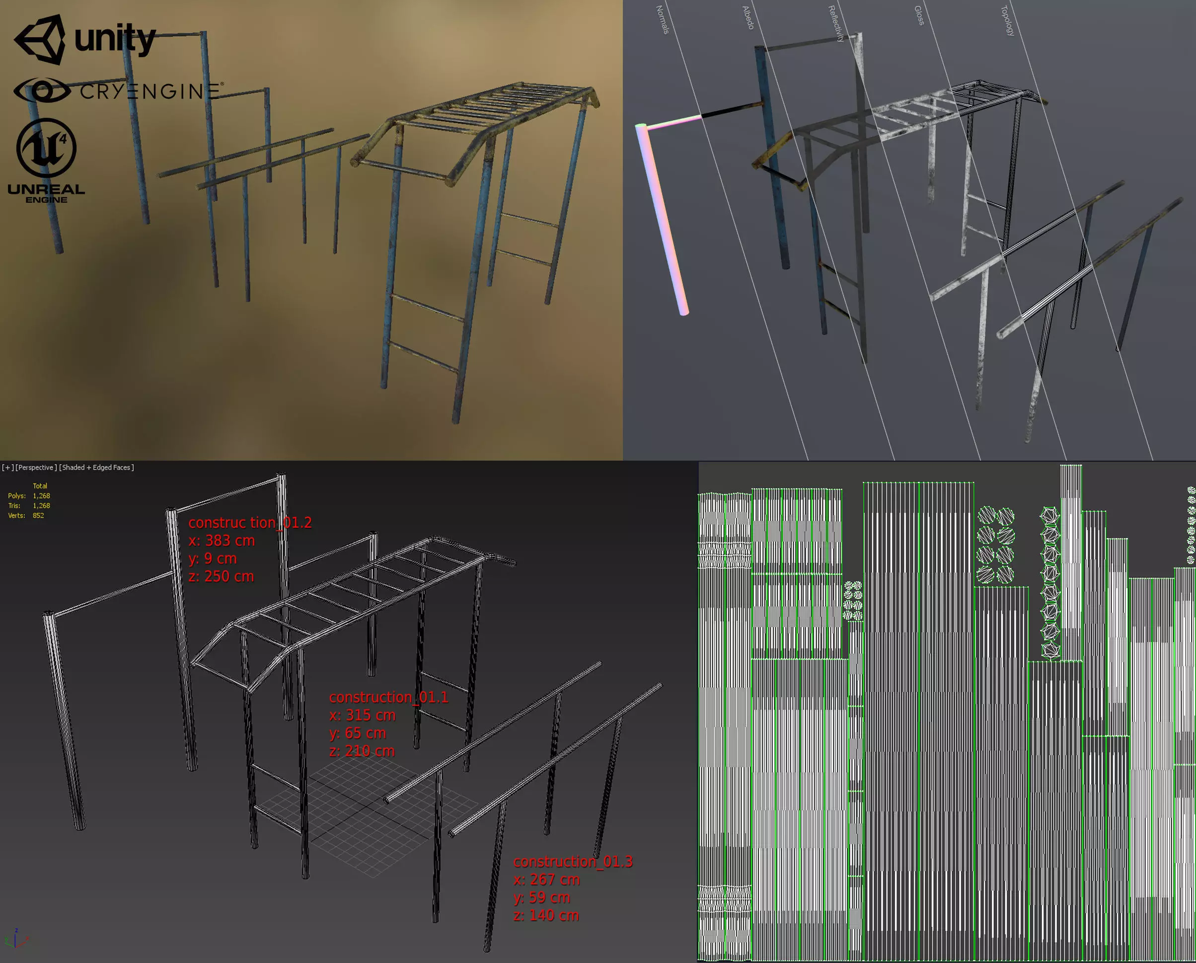 Ready for use in game engines such as Unity3d, Unreal Engine 4, CryEngine 5. Normal map was baked from a high poly model. The textures of the model are applied with UV Unwrap. Including OBJ, FBX formats and textures (4096x4096) TGA, TIF Units used: cm construction_01.1 x: 315, y: 65, z: 210cm construction_01.2 x: 383, y: 9, z: 250cm construction_01.3 x: 267, y: 59, z: 140cm Polygons: 1268 Triangles: 1268 Vertices: 852