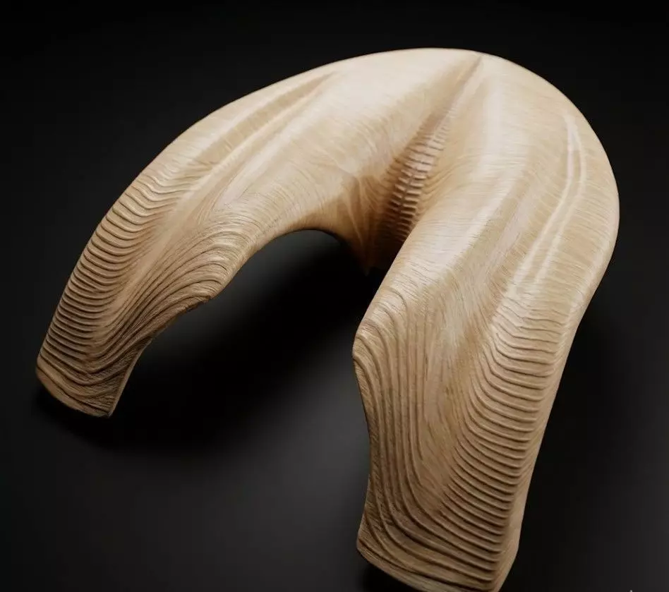 Headline: A high-quality 3D model of a futuristic organic pavilion with a realistic light wood finish. Designed with fluid parametric lines inspired by modern architecture (Zaha Hadid style).