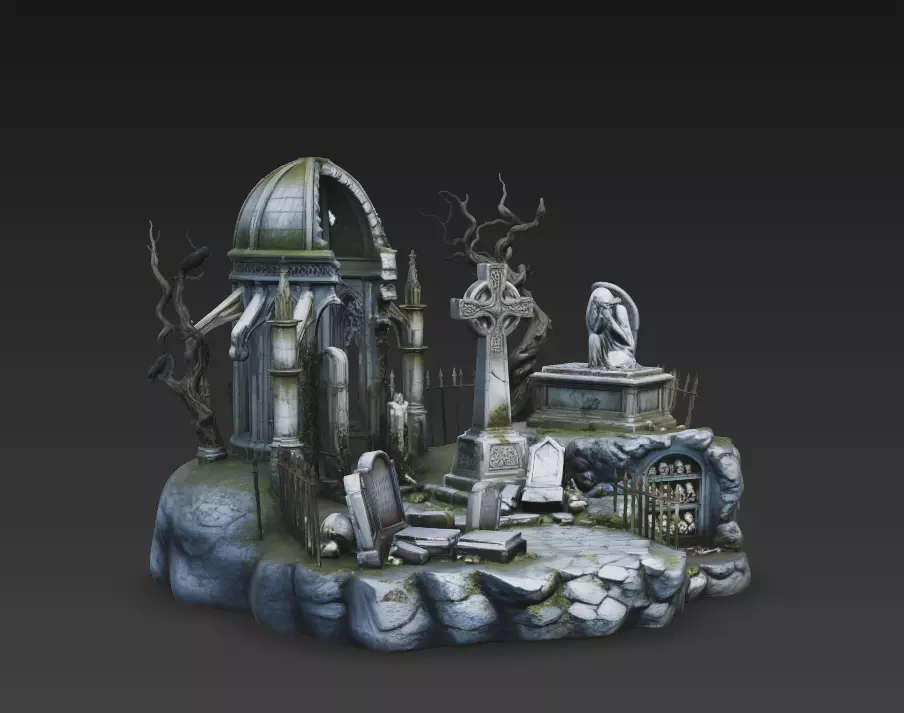 Bring dark fantasy and horror scenes to life with this incredibly detailed, photoscanned Gothic Cemetery Diorama. Crafted using high-resolution photogrammetry techniques, this realistic 3D environment captures the authentic weathering, moss accumulation, and structural decay of a forgotten graveyard. Designed as a self-contained floating diorama, it serves as a perfect focal piece for environmental storytelling, cinematic renders, or game development.
