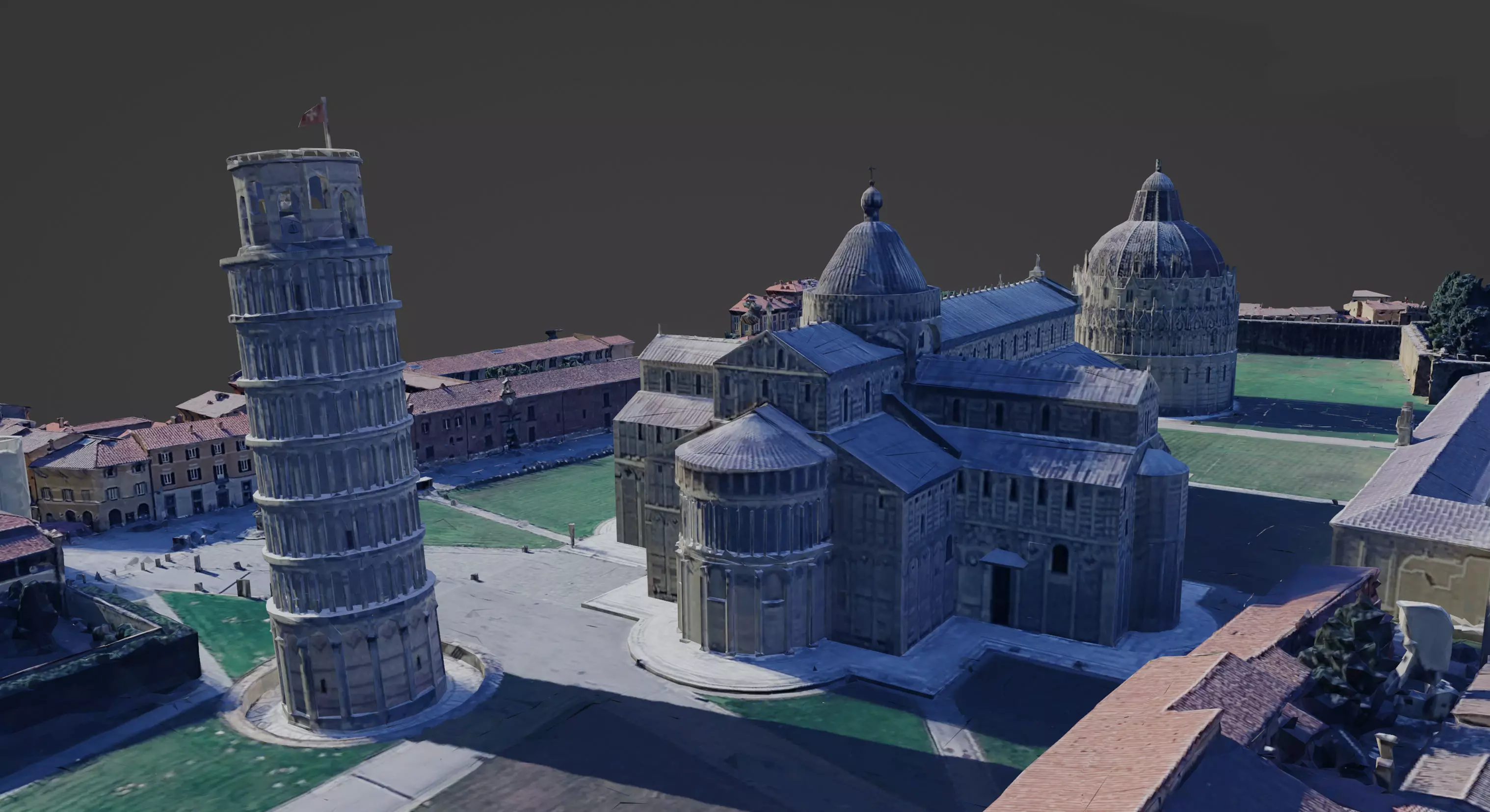 This is a realistic 3D scan of the Piazza dei Miracoli in Pisa, including the Leaning Tower, the Cathedral, the Baptistery, the Camposanto, and the surrounding area.The model is low-resolution, low-poly, and uses a single material.