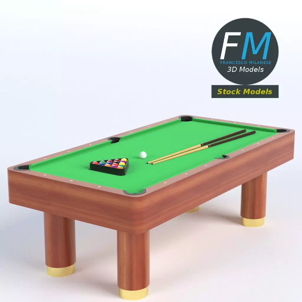 Billiard pool table 3D Model. 20 individual objects (table, triangle, 2 pool sticks, 16 balls) sharing 4 non overlapping UV Layout maps, Materials (table, triangle, balls, sticks) and PBR Textures set. Production-ready 3D Model, with PBR materials, textures, non overlapping UV Layout map provided in the package.