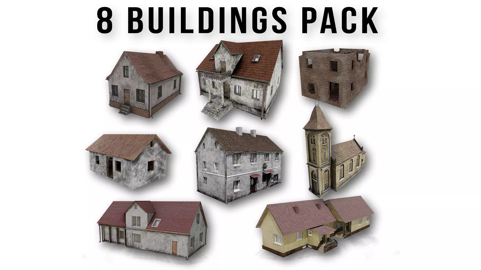 A pack of eight abandoned / post-apocalyptic buildings made in a blender and substance painter