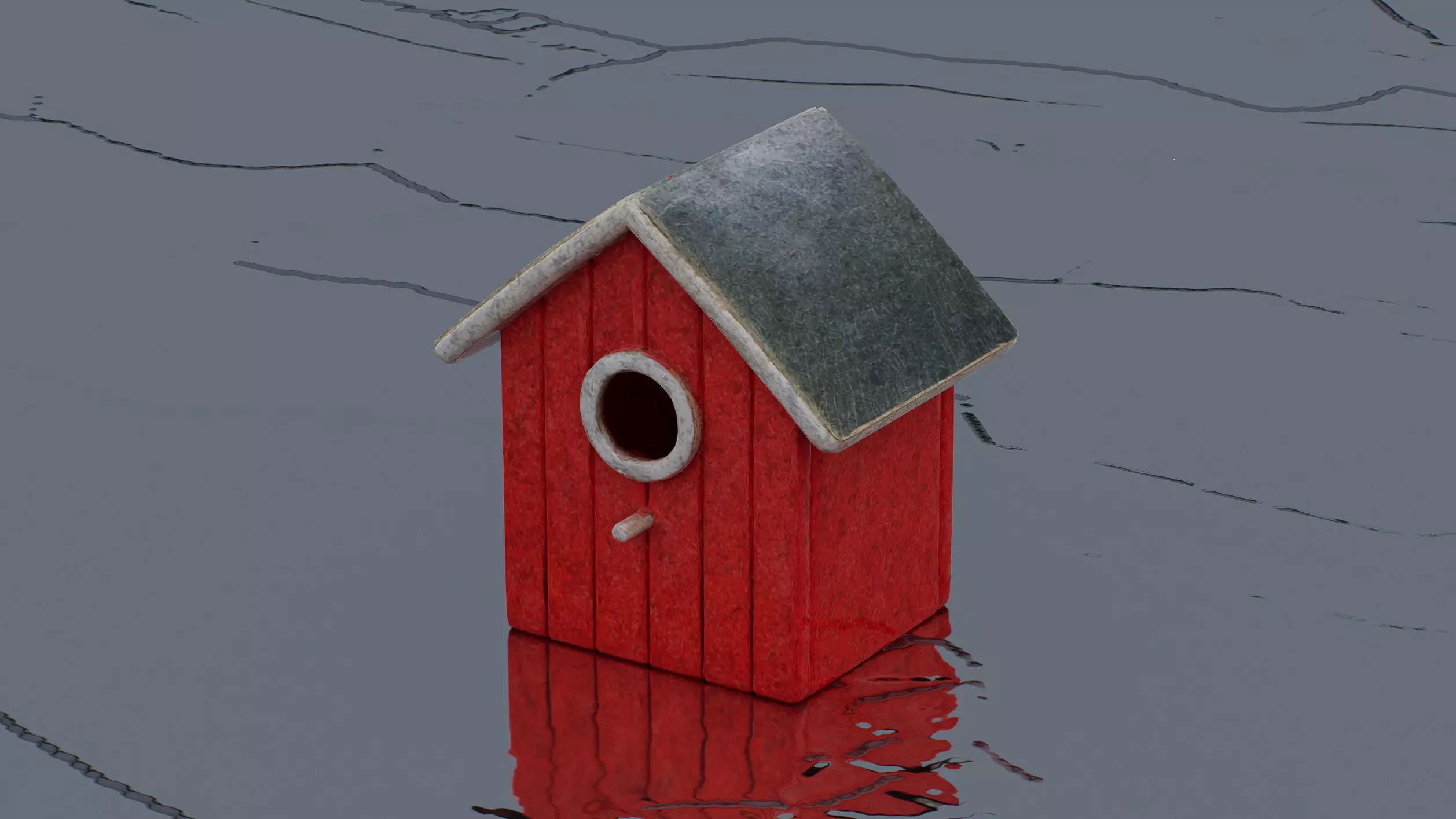This 3D low-poly model depicts a charming red birdhouse with a simple, rustic design. Featuring a sloped gray roof, a circular entrance, and a small peg for mounting, it combines functionality with a minimalist aesthetic. The textured wood grain adds a touch of realism, making it an ideal asset for games, animations, or decorative scenes.
