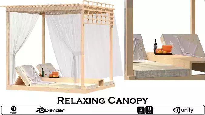 Modern Design: The canopy features a sleek wooden structure with sheer curtains, providing shade and a cozy, private ambiance.Comfortable Sunbeds: Includes two stylish sunbeds with cushions, perfect for relaxation or sunbathing.Decorative Elements: A side table with a pitcher of drinks, a bottle of wine, and glasses add a touch of realism and luxury.High-Quality Detailing: Meticulously crafted to ensure realistic textures and refined details, from the wood grain to the fabric of the curtains and cushions.Versatile Use: Ideal for virtual home designs, architectural visualizations, outdoor event scenes, or as a centerpiece in 3D renderings.Optimized for Rendering: Compatible with Blender, Unreal Engine, Unity, and 3ds Max for seamless integration into your workflow.