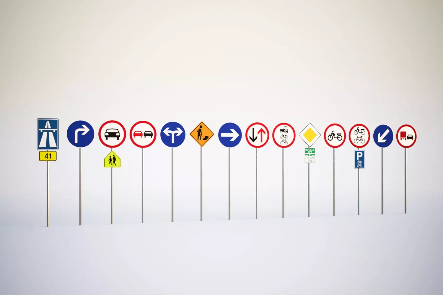 This realistic set includes vertical warning road signs, mandate, prohibition. Marking placed on metal poles.Model prepared for 3d architectural visualisations and other graphic works.