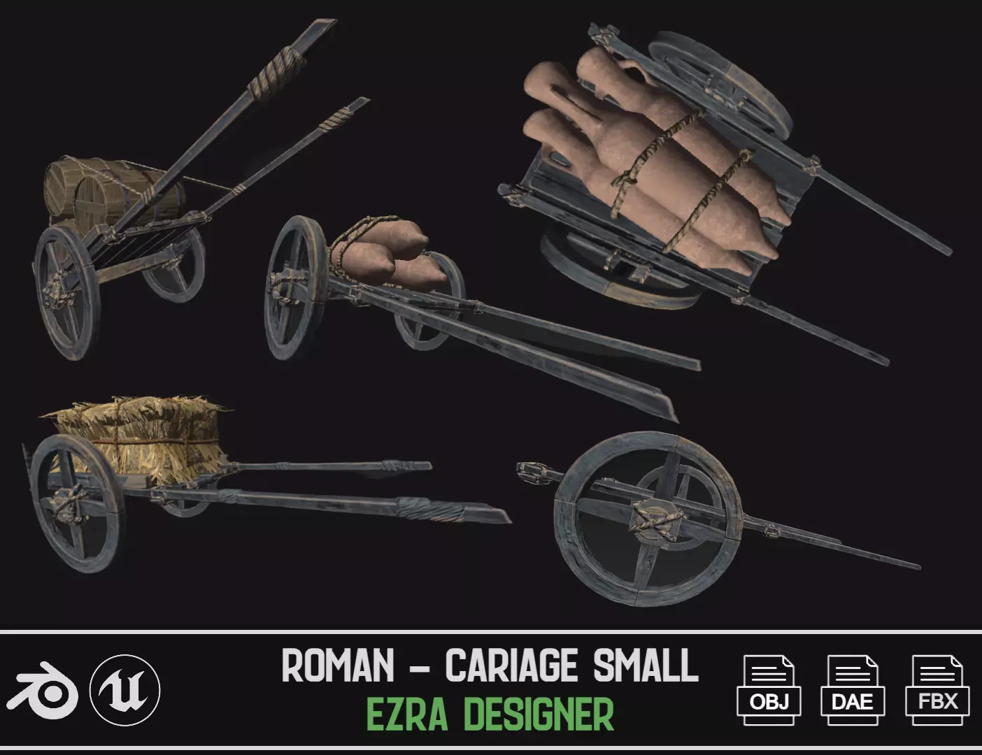 Enhance your historical dioramas and reenactments with our collection of 6 meticulously crafted 3D models of small Roman carriages. Each carriage in this assortment replicates the elegance and functionality of Roman transportation, featuring precise detailing and authenticity. Whether you're a history enthusiast, a model enthusiast, or simply want to add a touch of Roman authenticity to your projects, these 3D small Roman carriages are the perfect addition.