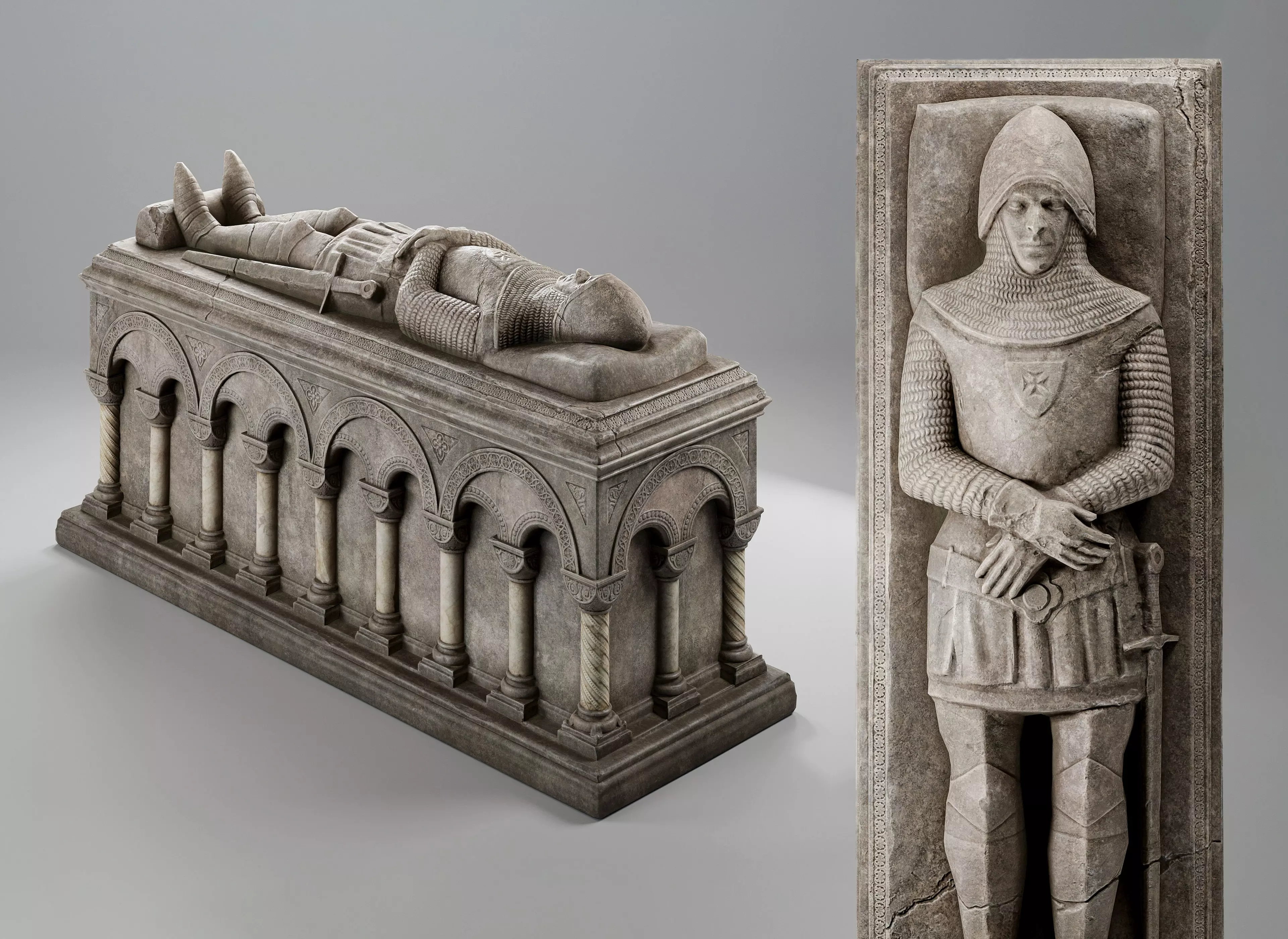 Stone Sarcophagus: 2 sets of 2K PBR textures - diffuse, metalic, roughness, (OpenGL and DirectX) normal, ambient occlusion + packed Unreal Engine - occlusion, metallic, roughness map.