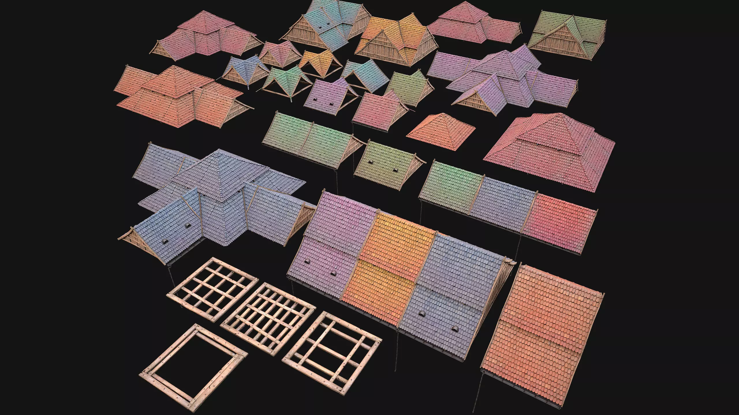 Game ready Roof Set Medieval City Pack .The model contains lods, detailed information on the images.Stylized and detailed Roof Set Medieval City Pack Constructor textured, sculpted and rendered with Physical based rendering (PBR) - Shown images have been rendered in Marmoset Toolbag .The set contains 27 models of roof with tiles and 20 models of wooden ceilings as well as 1 model of ventilation,as well as a constructor for creating Gutter.