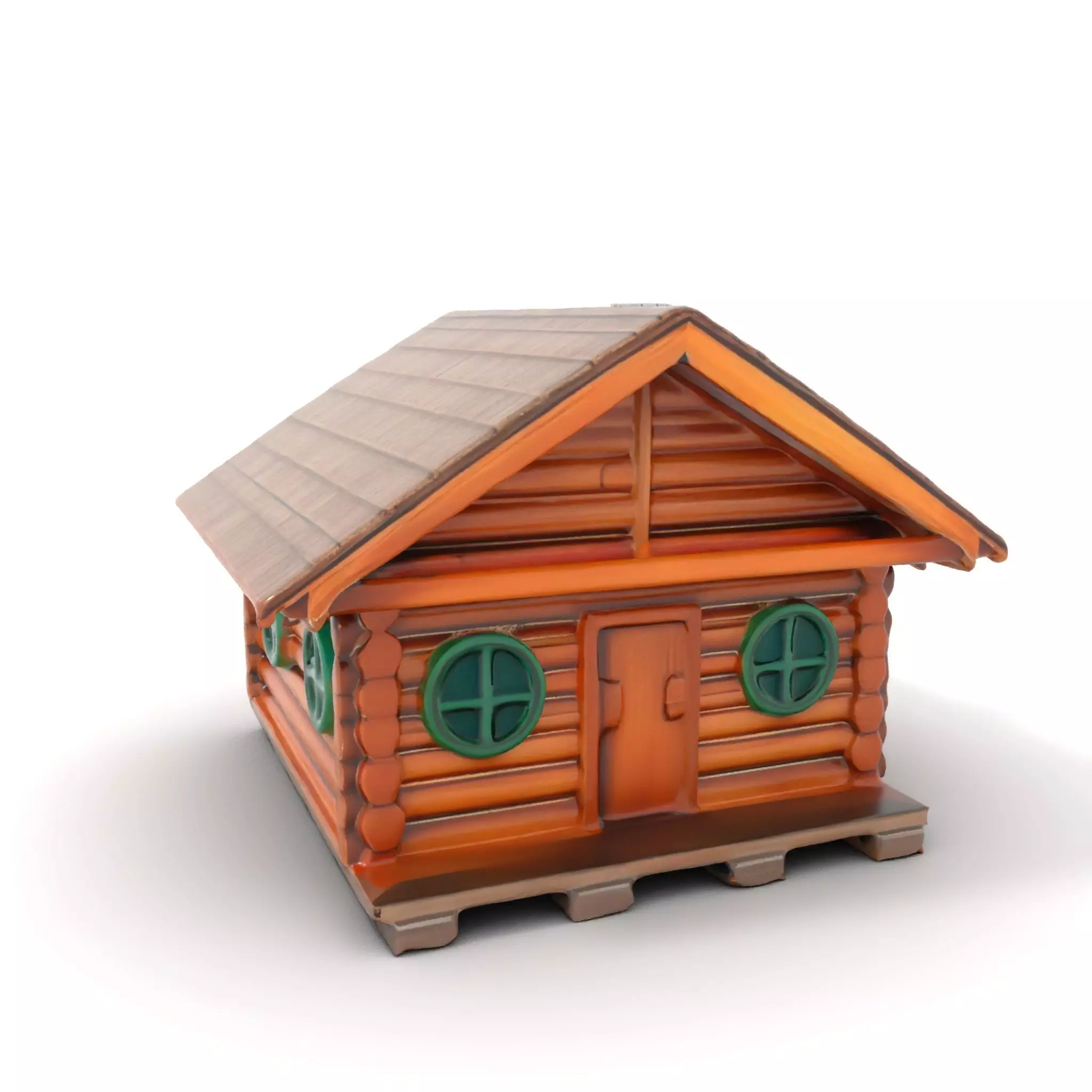 The Rustic Log Cabin model pack showcases a traditional wooden cabin with circular windows, a thatched roof, and a charming chimney, ideal for immersive environments.