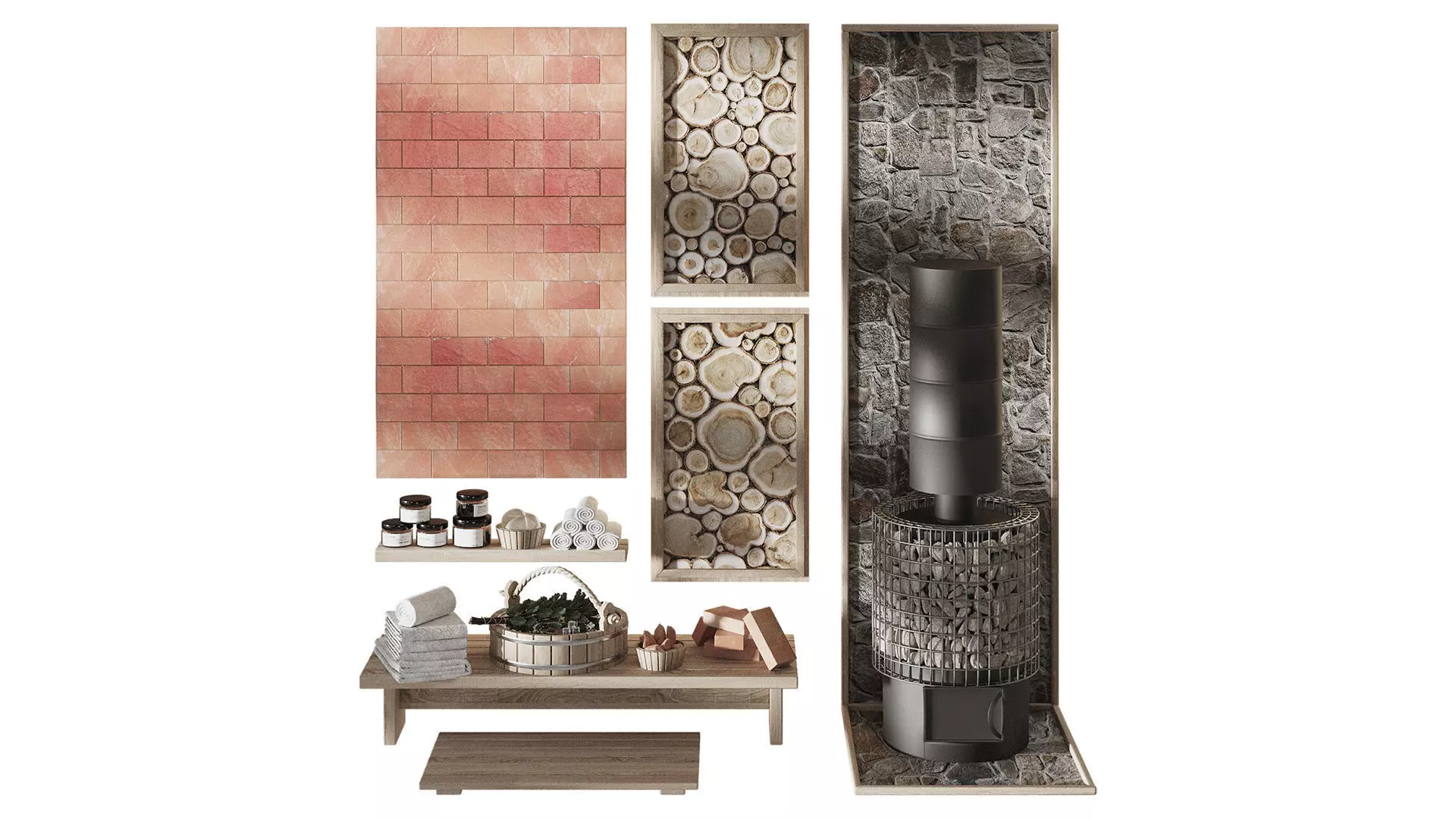 A set with oak brooms and Himalayan salt for baths and saunasRender created in Corona 6.For Corona render, it is recommended to install version no lower than 1.5, since the glossiness of materials is configured taking into account PBR.