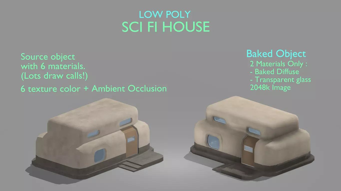 Sci fi house model. FBX files included in rar files.3 different mesh separated for indoor and outdoor usage (base, roof and door/ check preview for details).Mesh details :