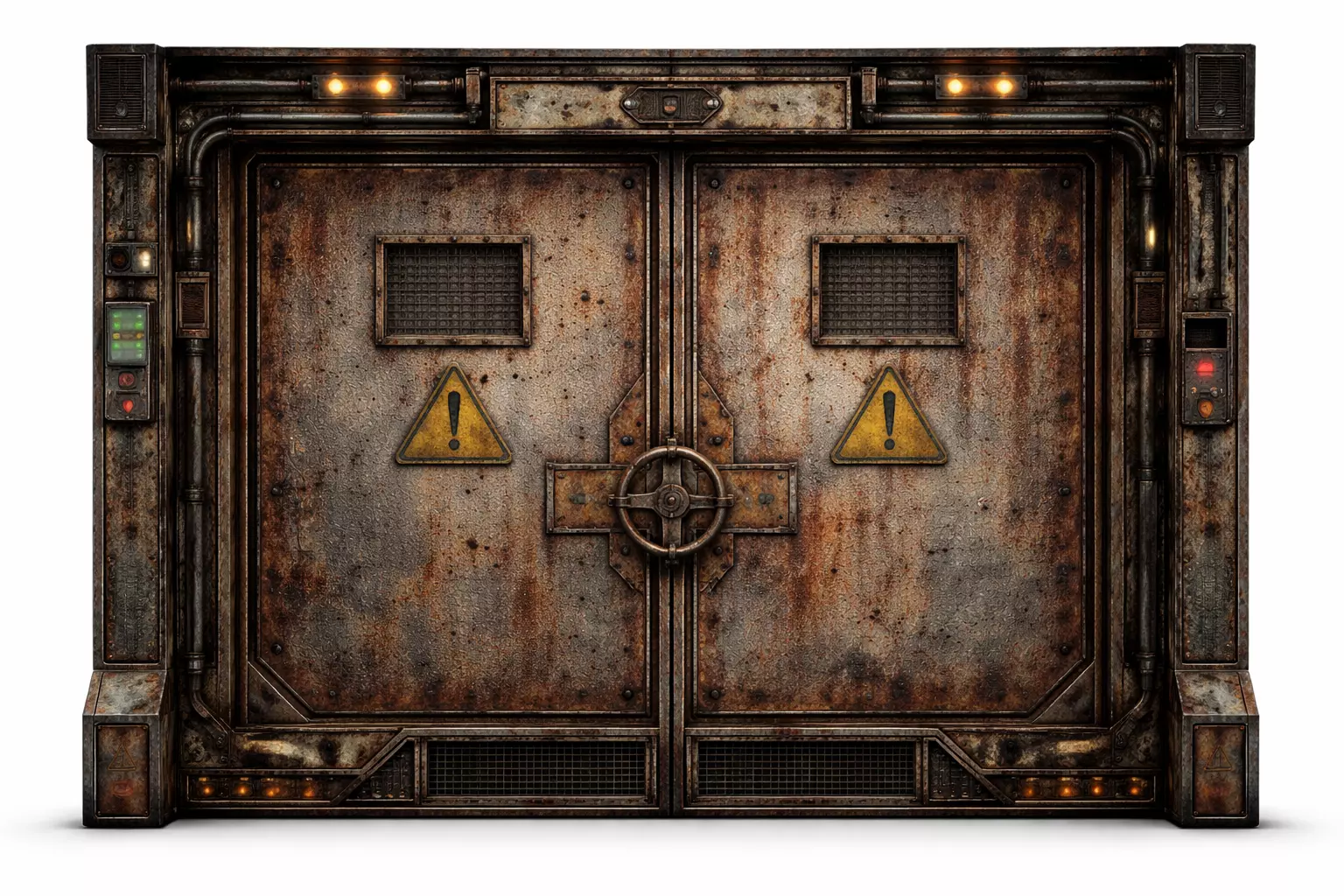 High-quality Sci-Fi Rusted Industrial Vault Door designed for futuristic, industrial, and post-apocalyptic environments. This asset features heavy metal panels, realistic rust damage, warning signs, mechanical locking system, pipes, and industrial lighting — perfect for immersive storytelling scenes.