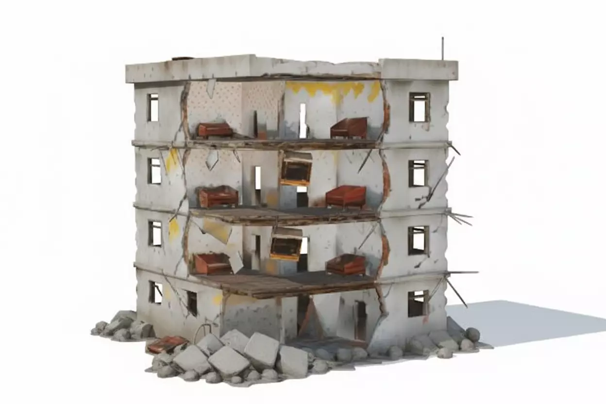 The Overall Concept This is a larger-scale destruction asset compared to the previous one. It depicts a four-story residential apartment block that has had its entire front face sheared off. It is perfect for urban warfare maps or cityscapes devastated by earthquakes or airstrikes.