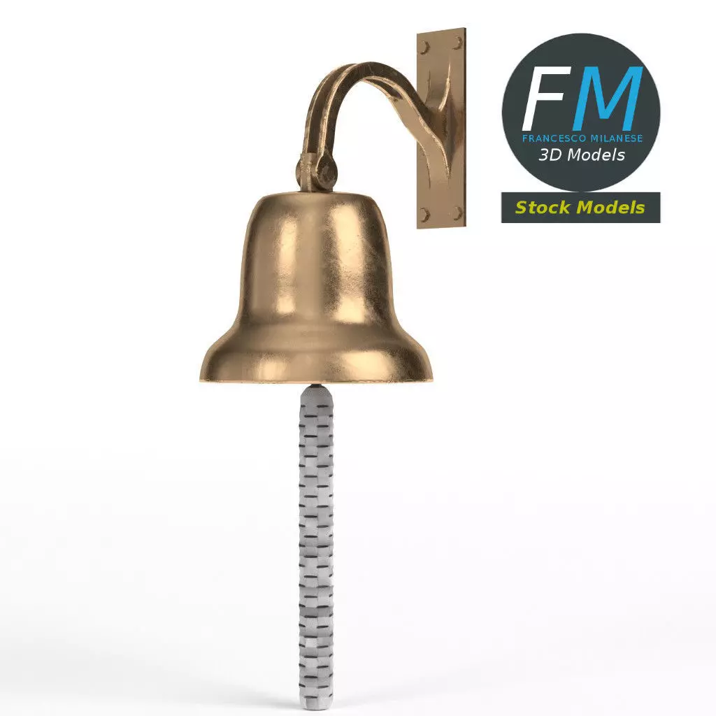 Ship bell 3D Model. 2 individual objects (ship bell, rope), each one with its own non overlapping UV Layout map, Material and PBR Texture set. Production-ready 3D Model, with PBR materials, textures, non overlapping UV Layout map provided in the package.
