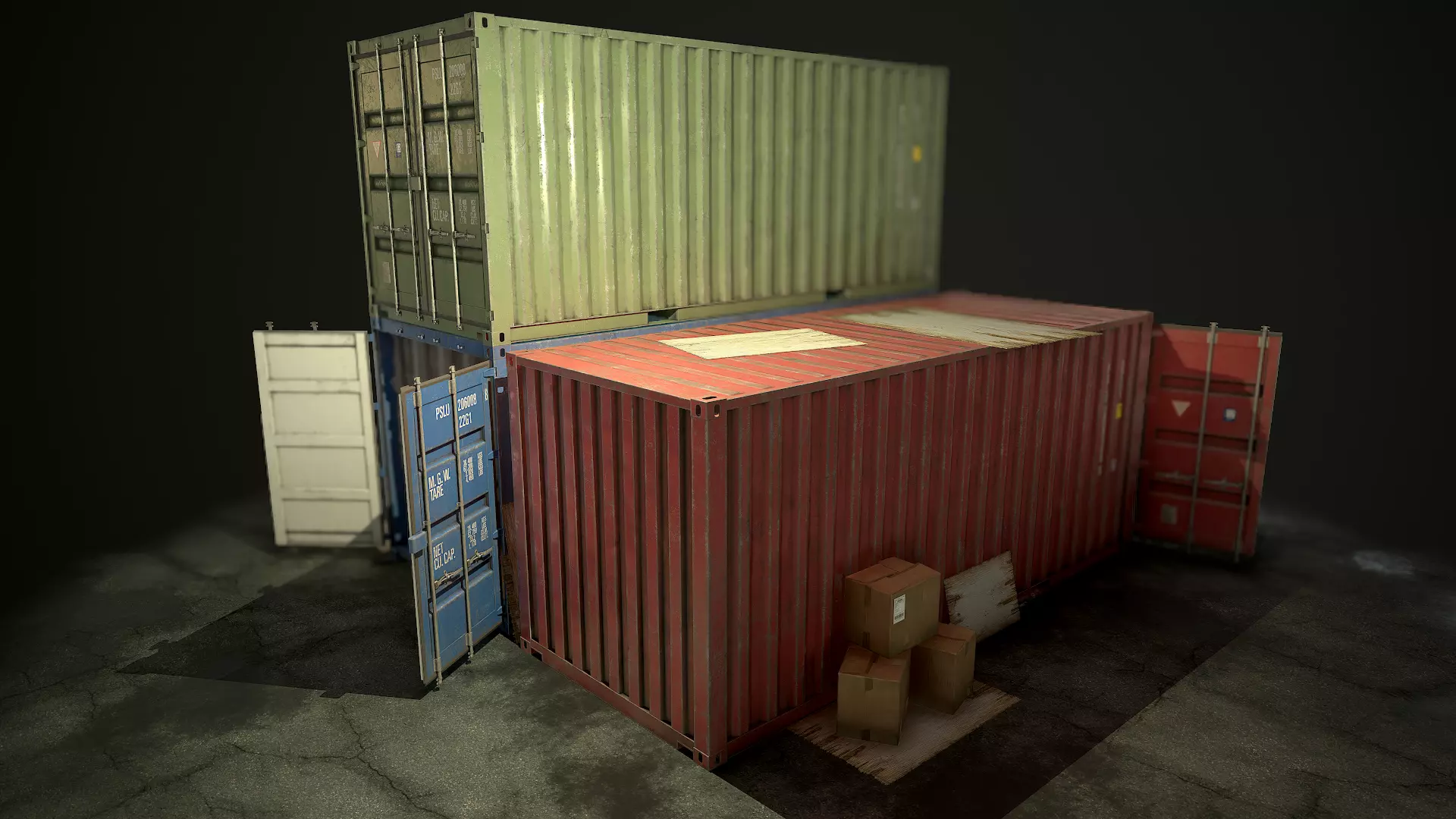 *Textures Shipping Container : 4096 x 4096 - Diffuse / Specular / Gloss / Normal Cardboard Box : 2048 x 2048 - Diffuse / Specular / Gloss / Normal Wood piece : 2048 x 2048 - Diffuse / Specular / Gloss / Normal / Alpha