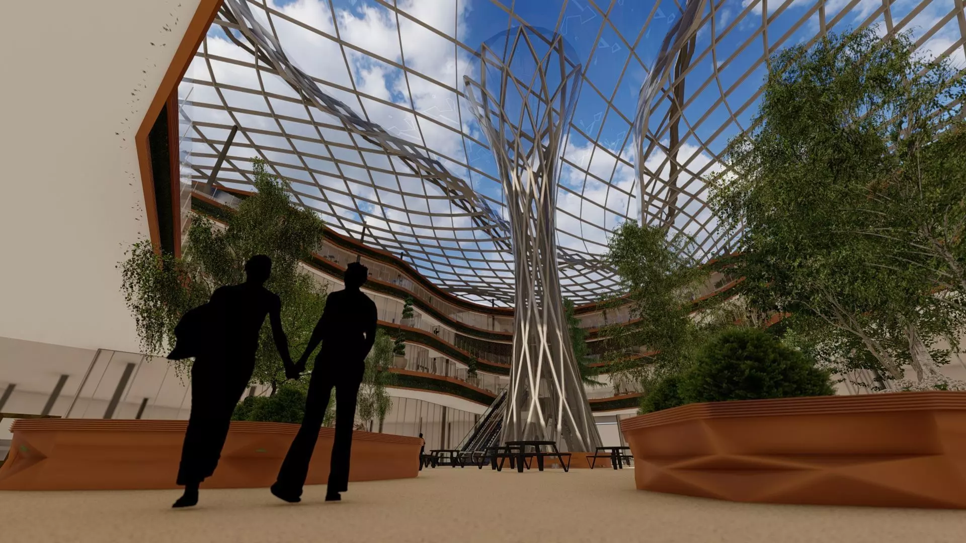 This three-level shopping center model includes two underground levels and one upper level, designed with the concept of the mall extending downward. It features wide, spacious corridors and a striking parametric support structure, along with an attractive three-piece roof design.