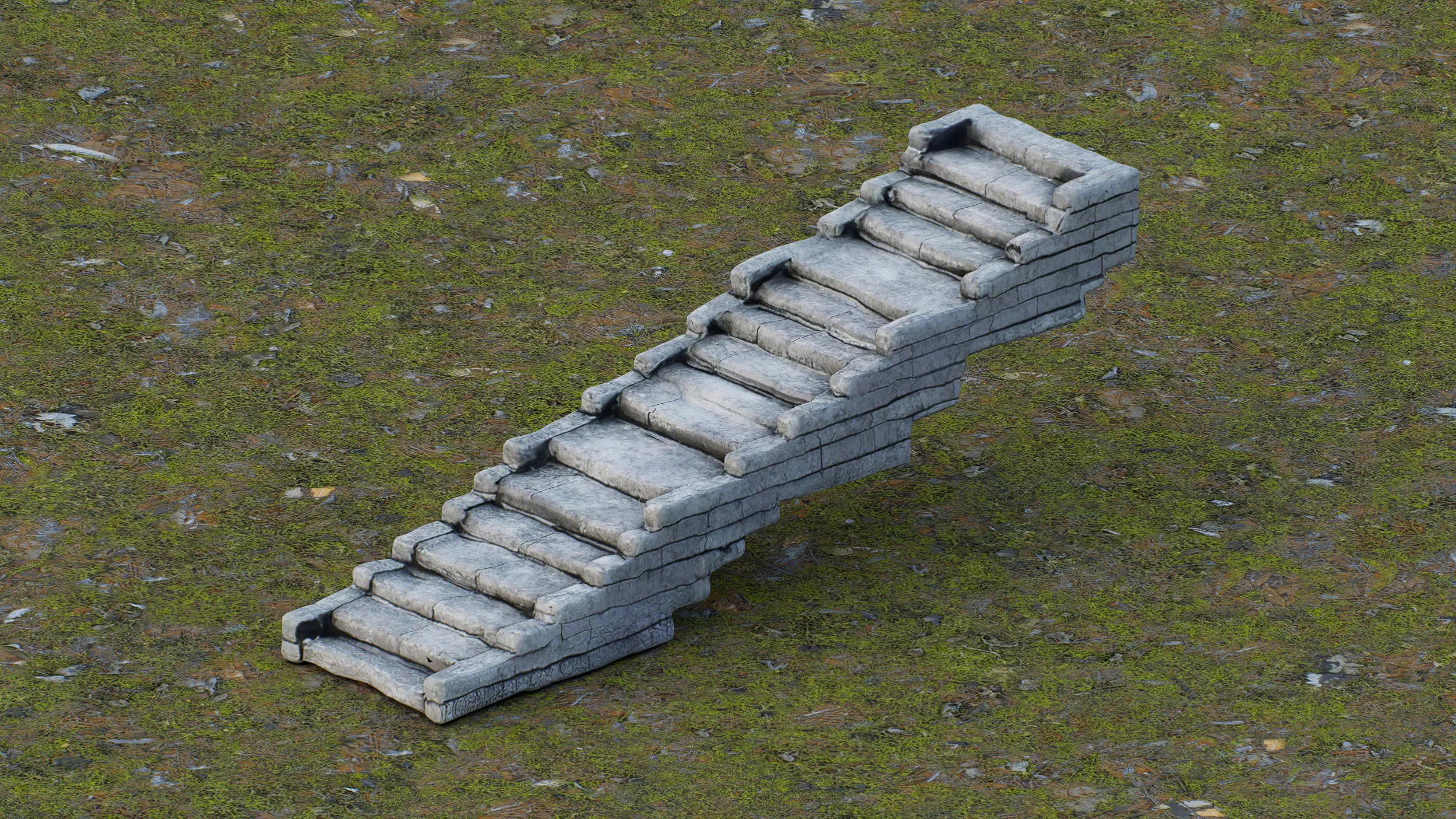 This 3D low-poly model depicts a rugged stone staircase, designed with a minimalist yet detailed approach. Crafted for use in video games, architectural visualizations, or educational projects, the model features a textured stone surface with a weathered appearance, giving it an authentic, ancient feel. The staircase ascends diagonally against a vibrant orange background, casting a subtle shadow that enhances its three-dimensionality. Its low-poly design ensures efficient rendering while maintaining visual appeal, making it a versatile asset for various digital environments.