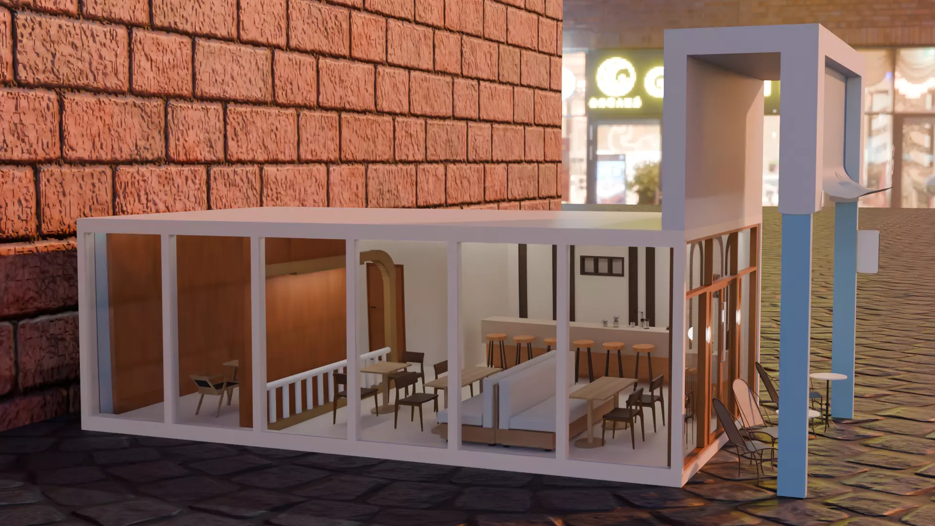 Complete café interior and exterior