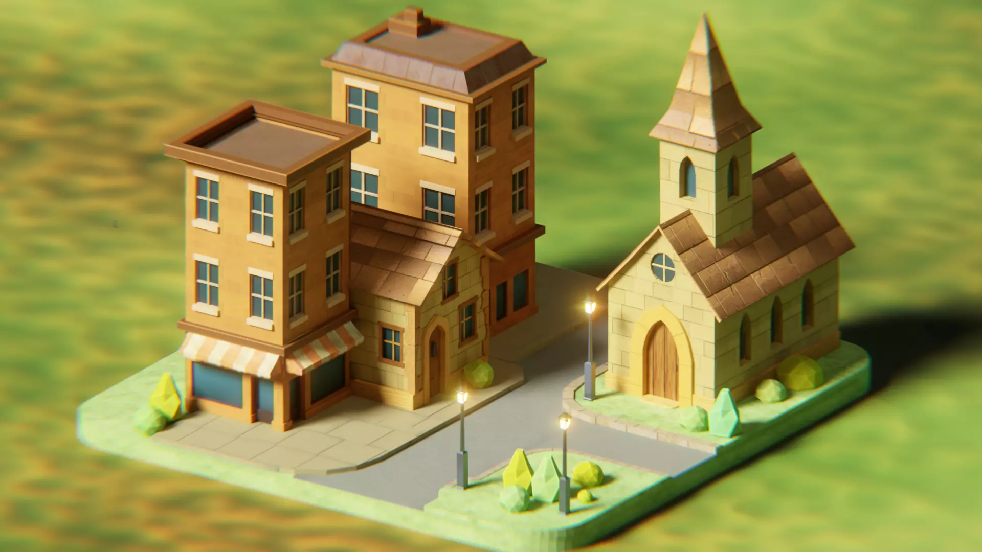 Includes: Church, 2x residential buildings, street lamps, sidewalk, and decorative foliage