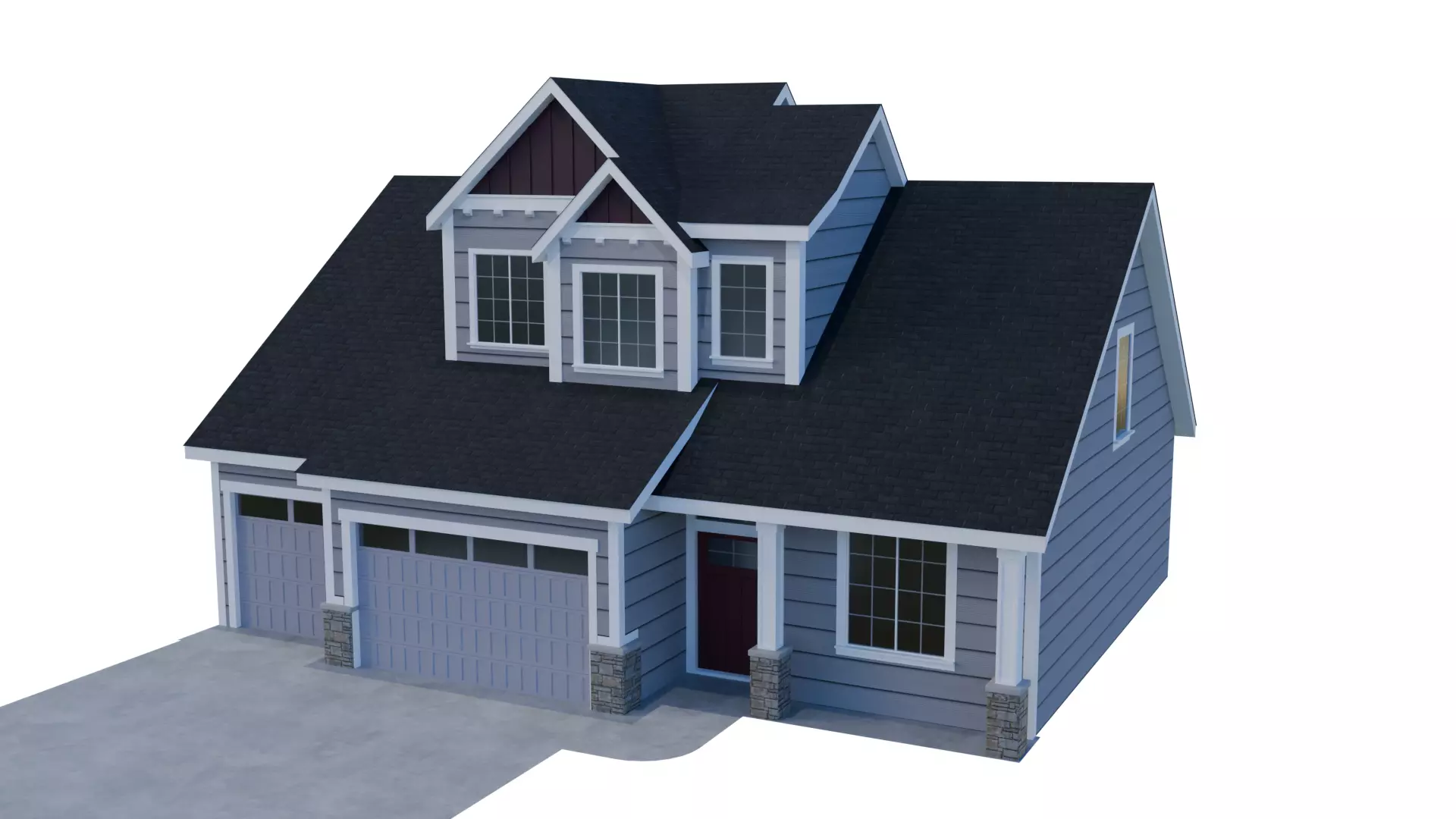 The model includes realistic architectural elements such as double-hung windows, a driveway. Exterior only.