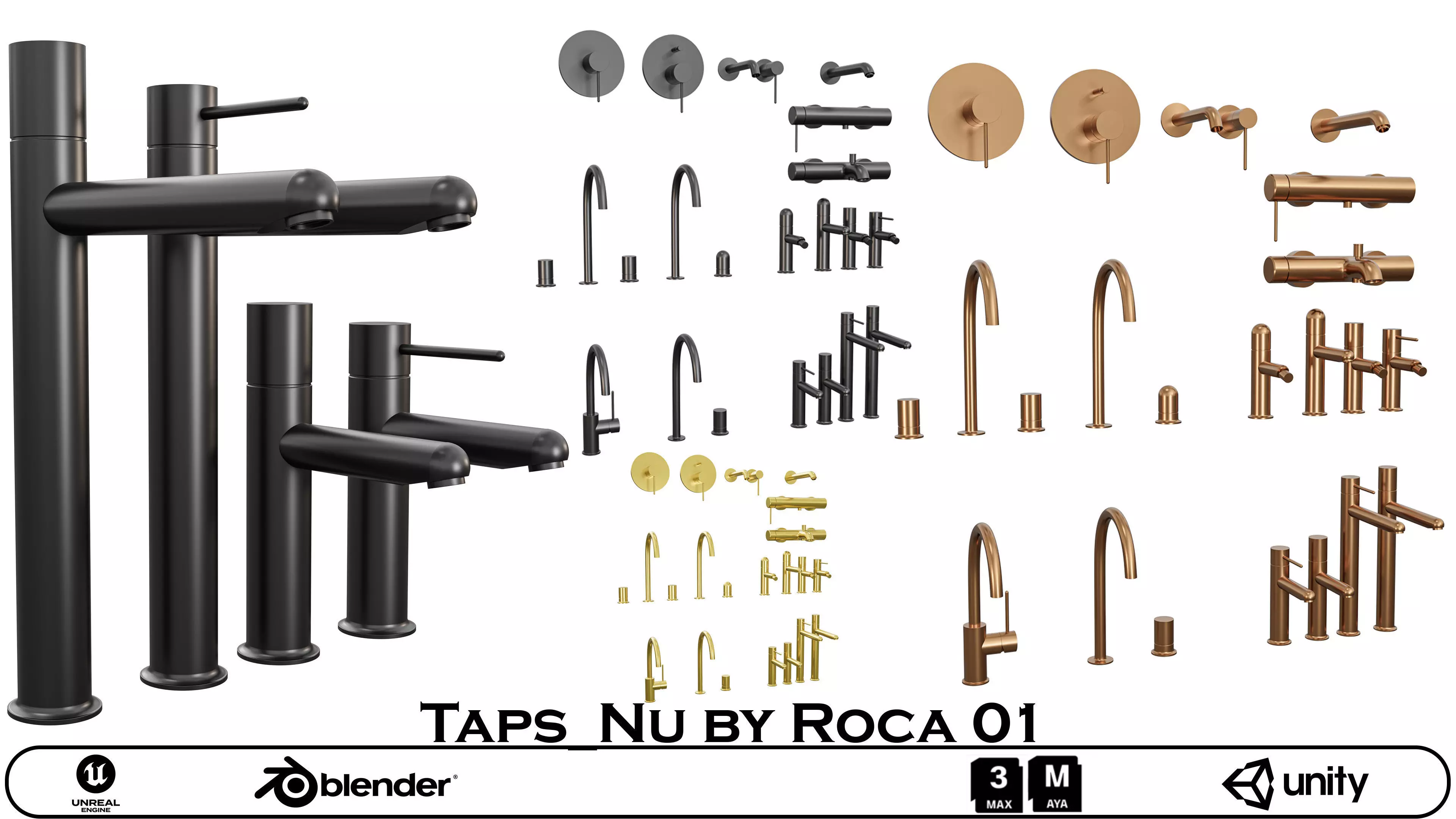 Realistic Design: Based on the elegant and minimal Nu by Roca series, featuring various configurations: wall-mounted, counter-mounted, shower mixers, and basin mixers.