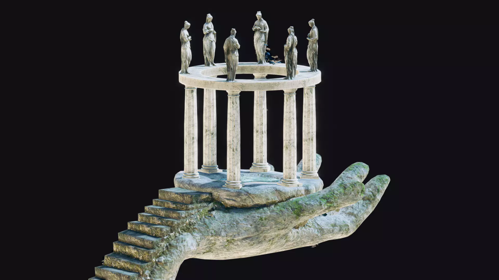 手のひらの形をした構造物が、円形の神殿を包み込むように支えています。神殿の上部には古典様式の柱と彫像が配置され、石造りの床には小さな水の池が彫り込まれています。