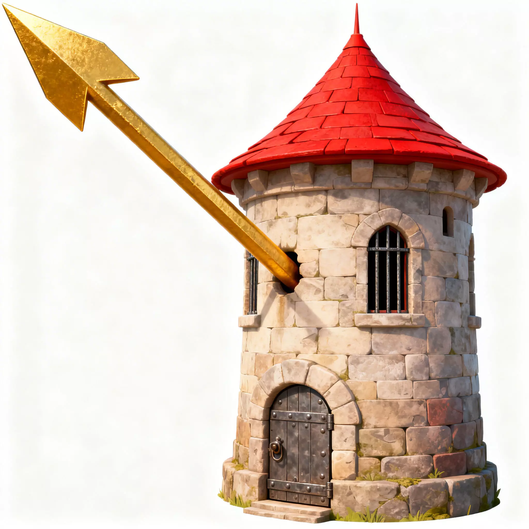 Massive Golden Arrow-HeadThe standout feature is the giant, solid gold arrow protruding from the side of the tower. The arrow-head features a slightly hammered, reflective metallic texture, suggesting it was fired by a god, a giant, or a legendary siege engine.